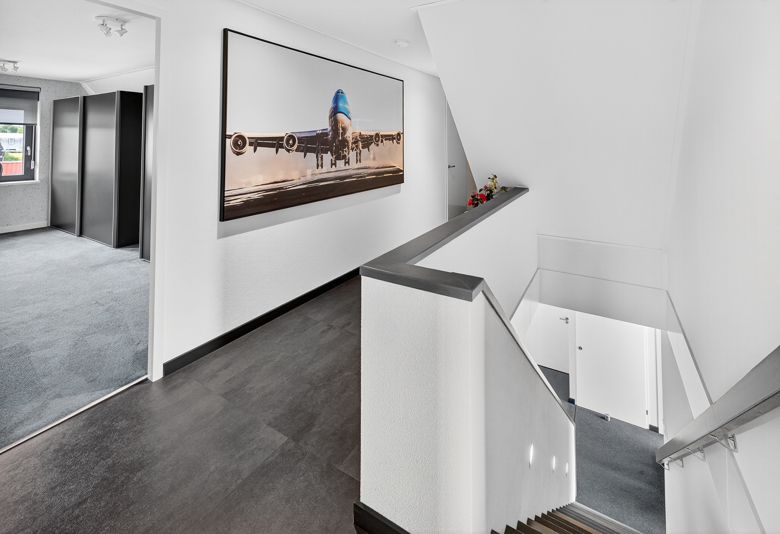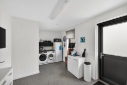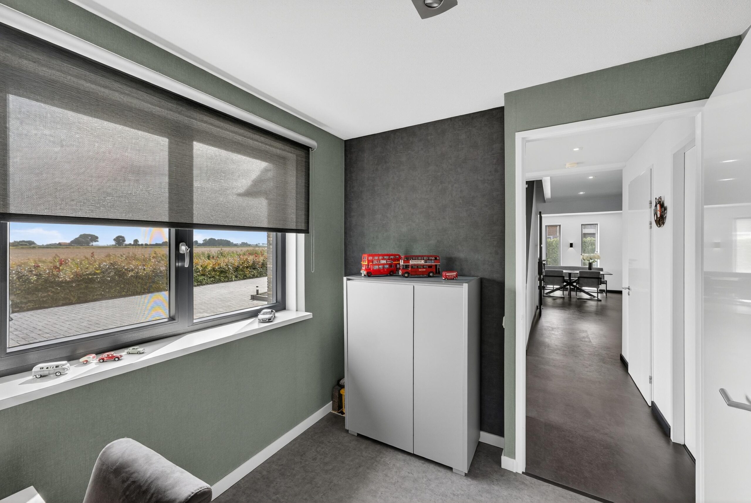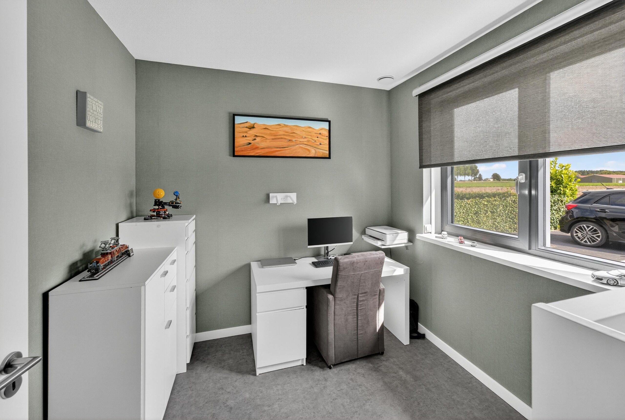 Vanuit de hal zijn ook de bijkeuken en werkkamer bereikbaar. De bijkeuken biedt ruimte voor witgoedaansluitingen en herbergt de warmtepomp. De werkkamer is een lichte, functionele ruimte met voldoende plek voor een bureau en opberging, ideaal voor werk of studie vanuit huis. De gehele begane grond is uitgerust met comfortabele vloerverwarming.