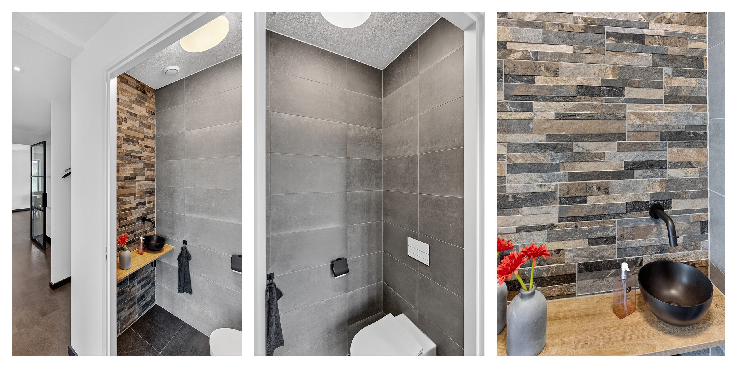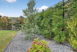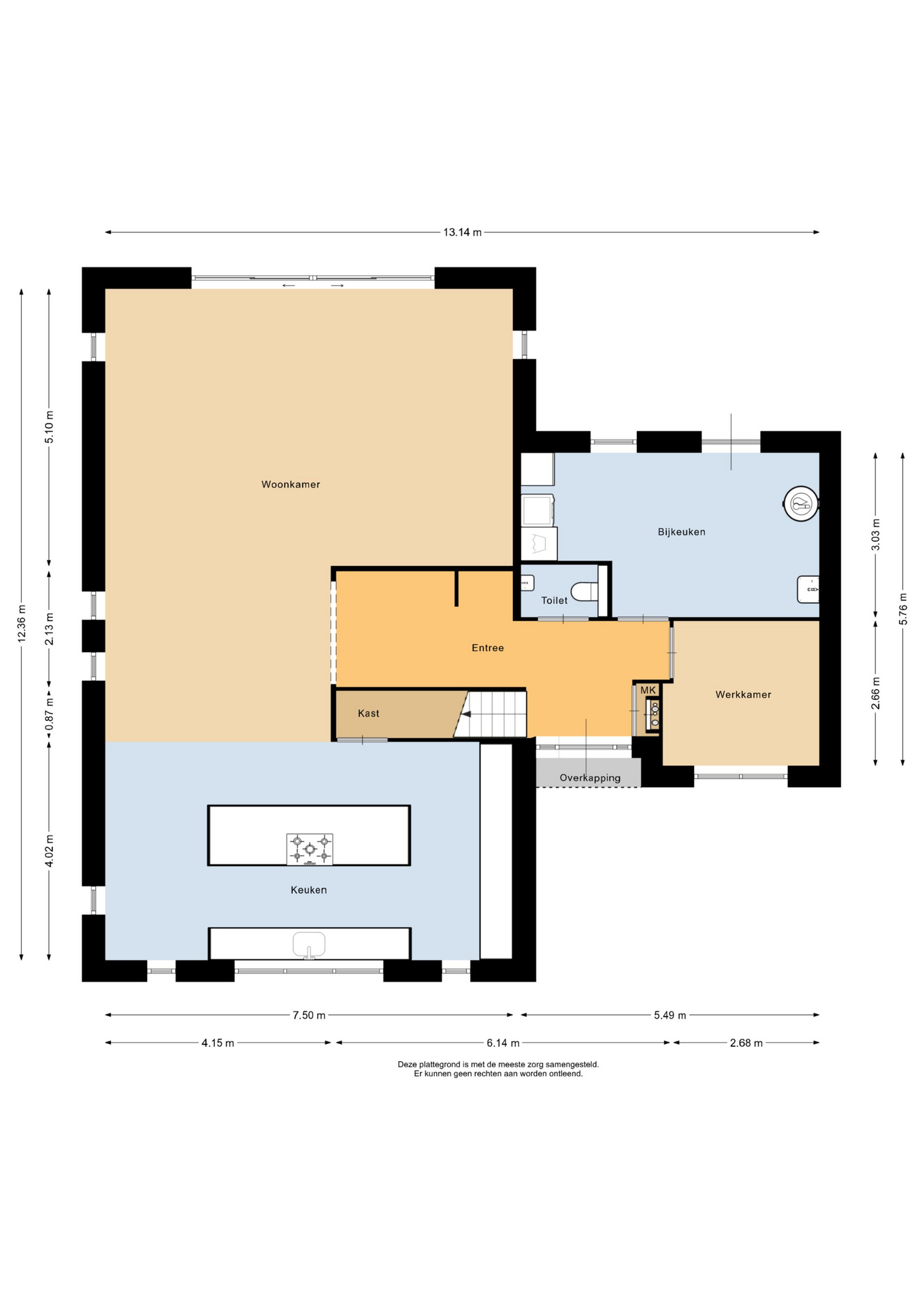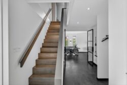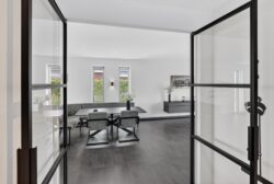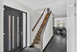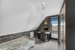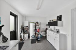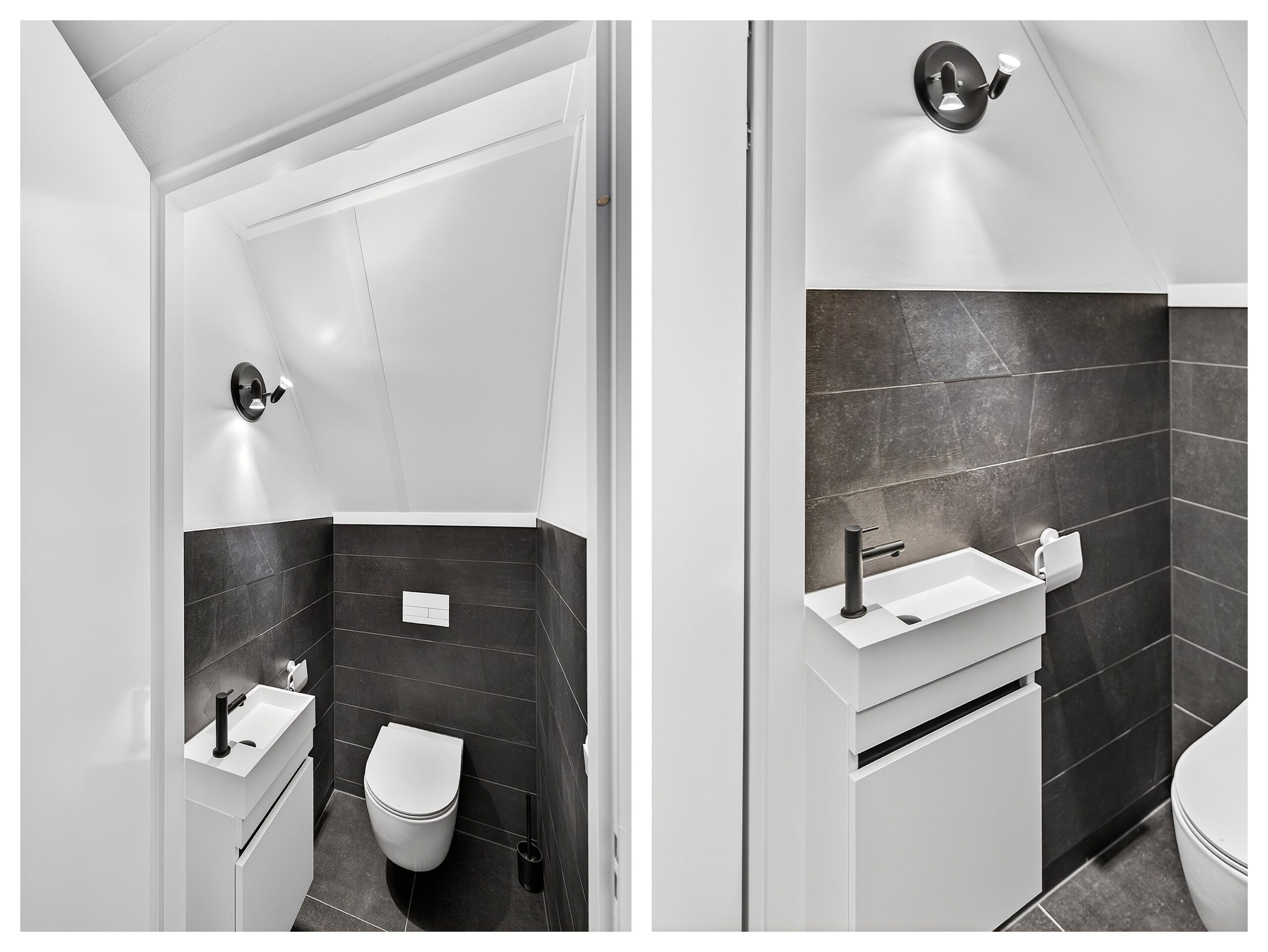 Vanuit de hal zijn ook de bijkeuken en werkkamer bereikbaar. De bijkeuken biedt ruimte voor witgoedaansluitingen en herbergt de warmtepomp. De werkkamer is een lichte, functionele ruimte met voldoende plek voor een bureau en opberging, ideaal voor werk of studie vanuit huis. De gehele begane grond is uitgerust met comfortabele vloerverwarming.