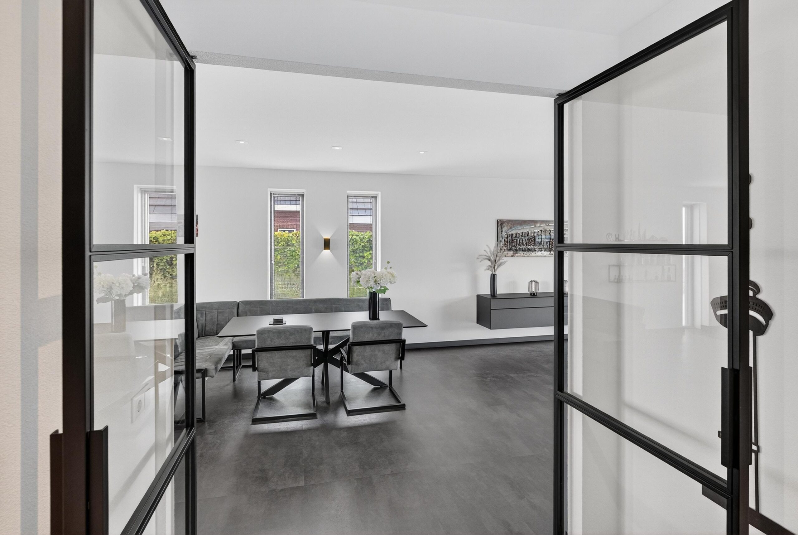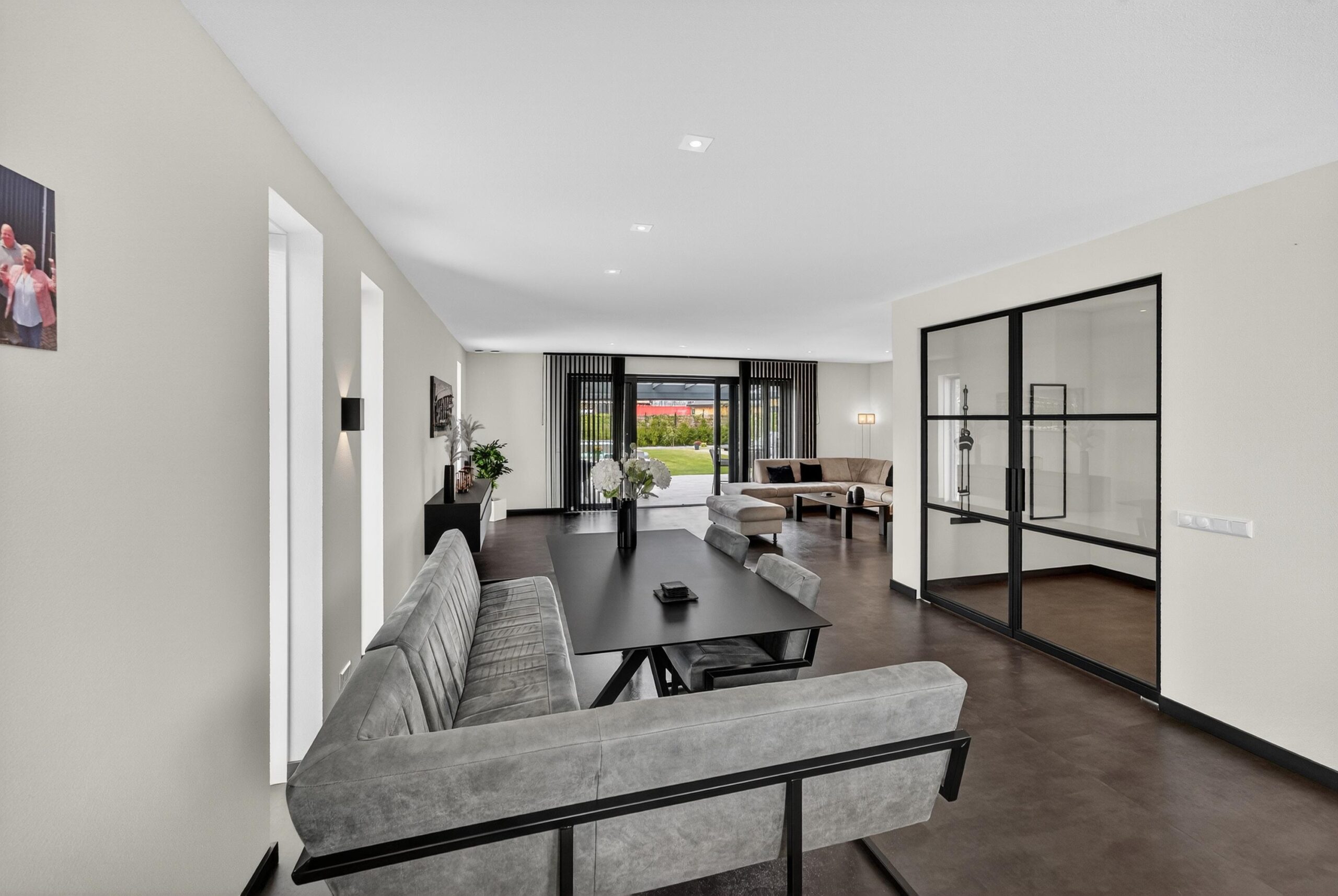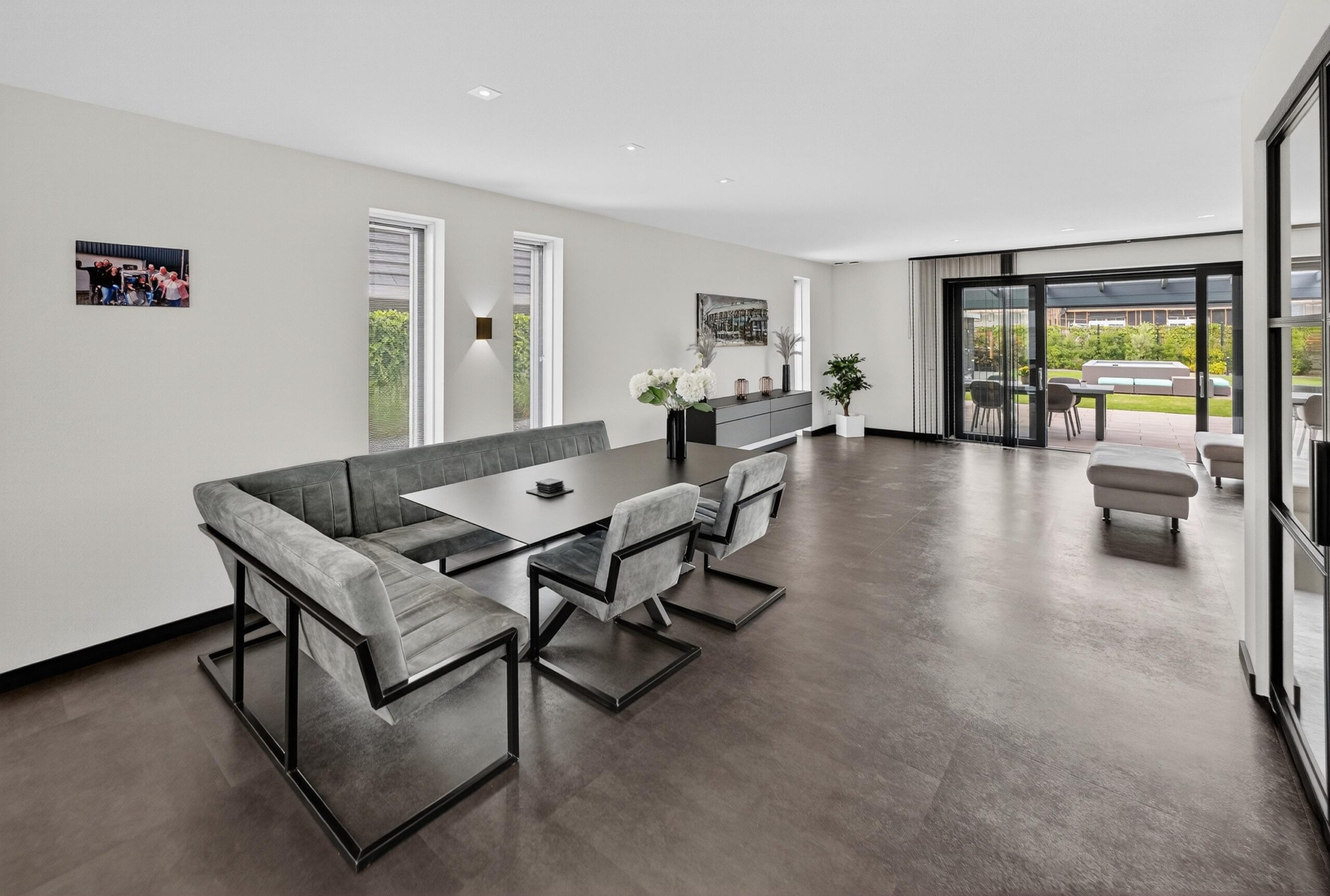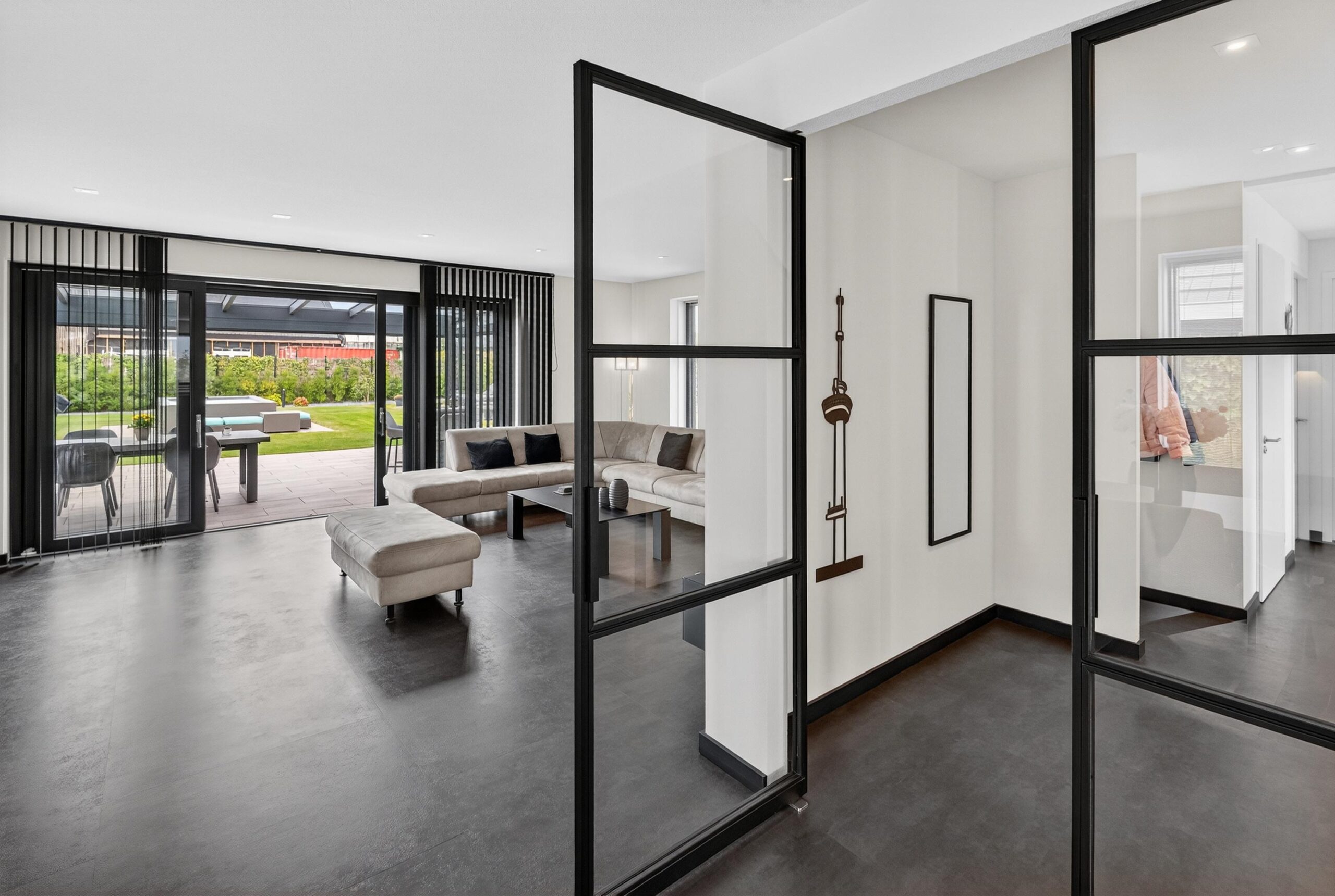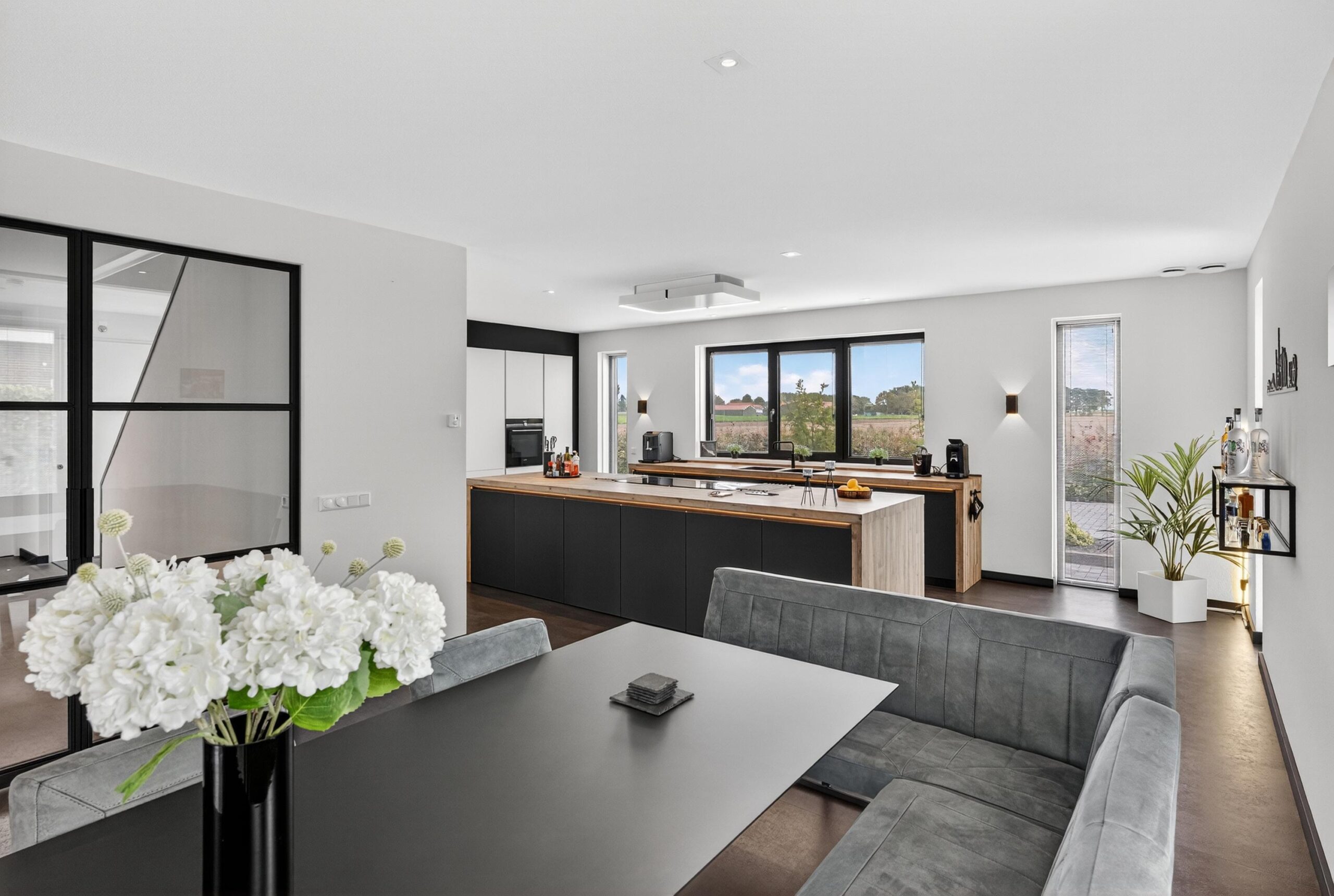 Via de ruime oprit bereikt u de voordeur en stapt u de lichte en ruime entreehal binnen. De hal, voorzien van meterkast en toilet, biedt toegang tot alle vertrekken. Twee glazen binnendeuren leiden naar de royale woonkamer met open keuken. Dankzij de vele raampartijen geniet u van maximale lichtinval en een gevoel van vrijheid. De schuifpui vormt een elegante overgang tussen binnen en buiten, waardoor de tuin en het zwembad als het ware onderdeel worden van uw leefruimte. De open keuken met kookeiland is een echte blikvanger. Het strakke design in combinatie met hoogwaardige afwerking maakt koken hier een plezier. De keuken is volledig uitgerust met dubbele kookplaat, afzuigkap, twee ovens, twee koelkasten, vaatwasser en Quooker heetwaterkraan, zodat zowel dagelijkse maaltijden als uitgebreide diners moeiteloos bereid kunnen worden.