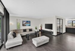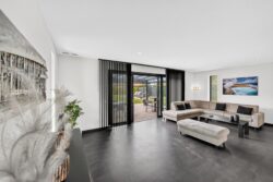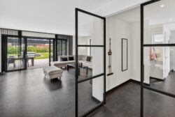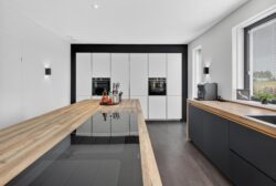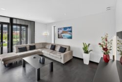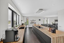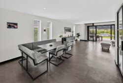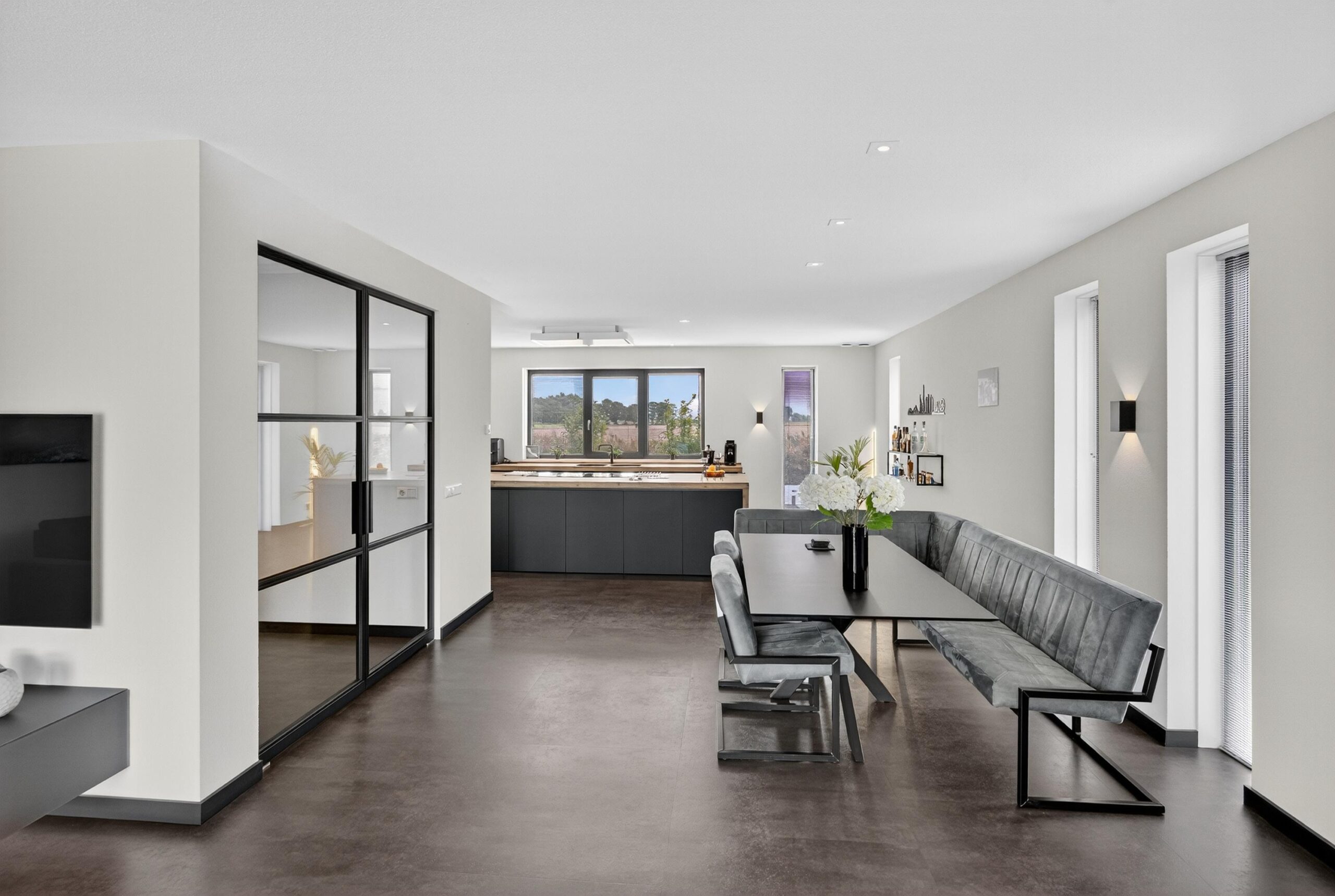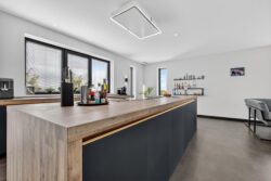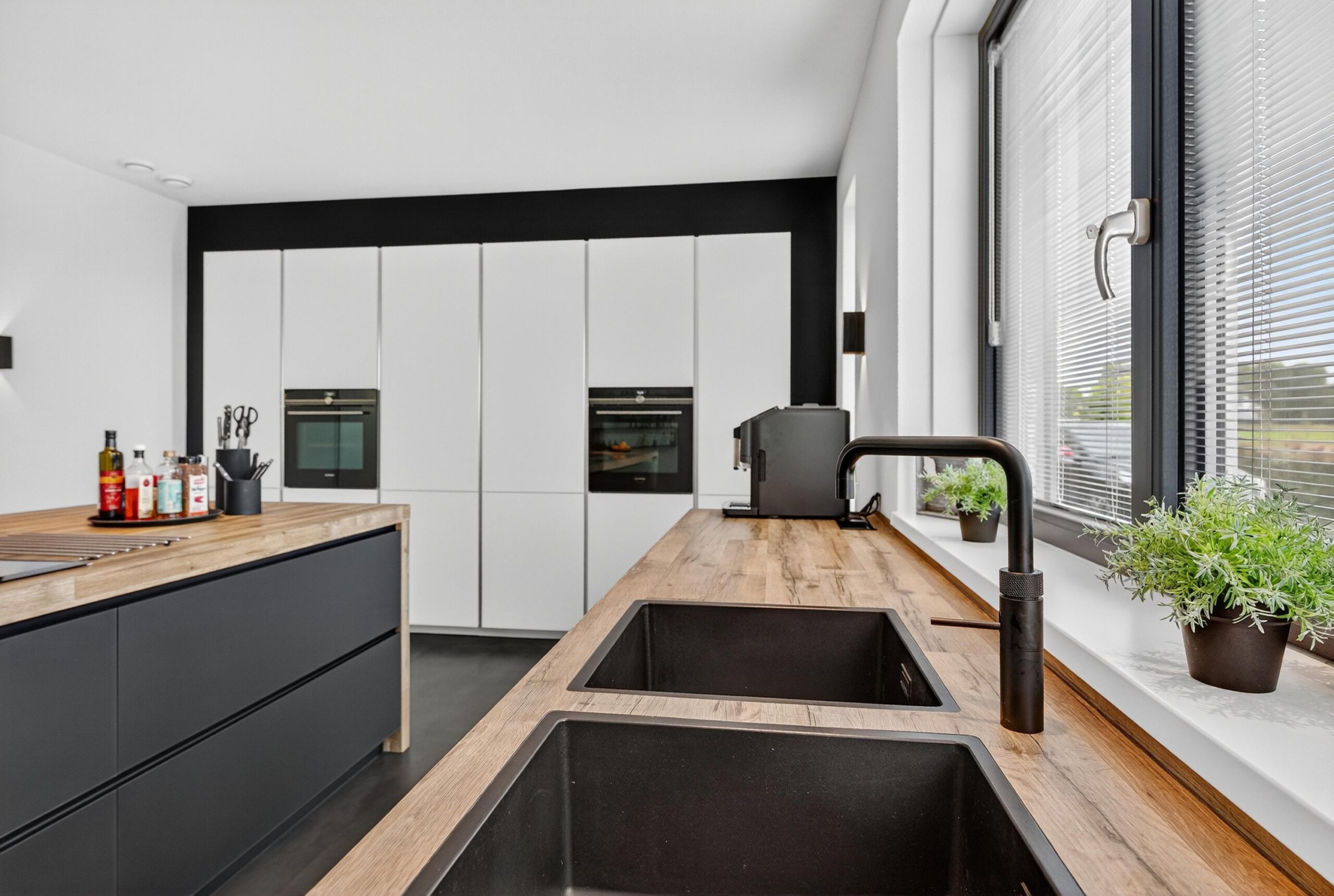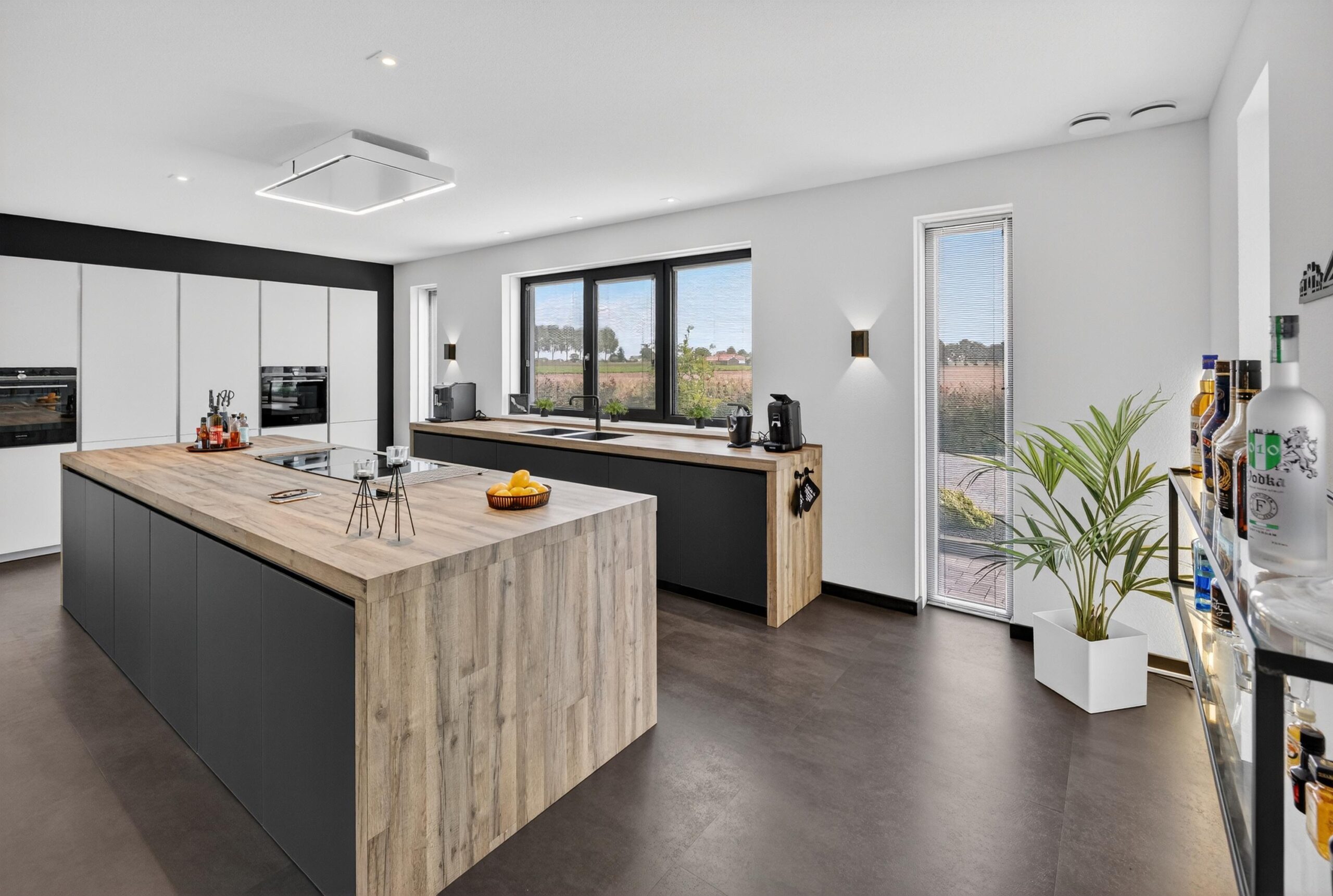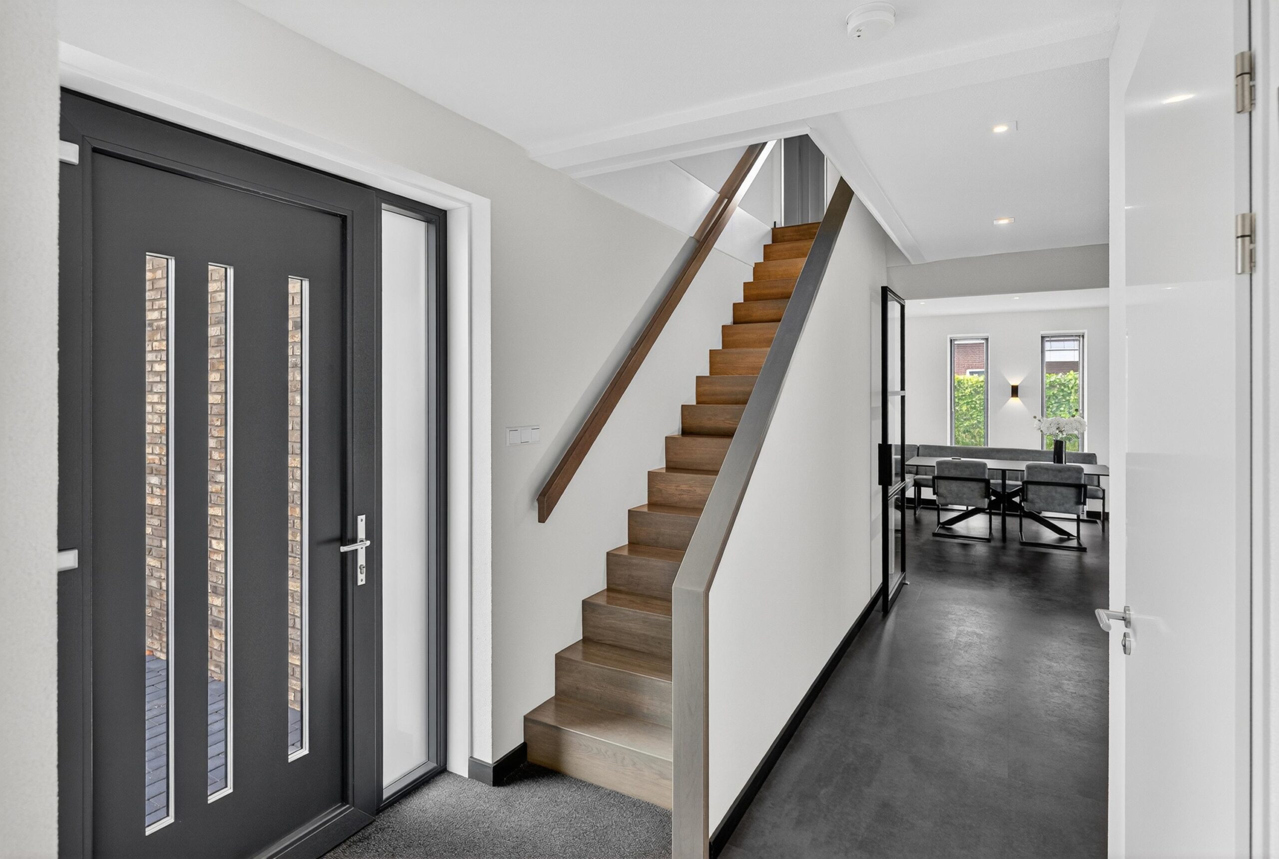 Via de ruime oprit bereikt u de voordeur en stapt u de lichte en ruime entreehal binnen. De hal, voorzien van meterkast en toilet, biedt toegang tot alle vertrekken. Twee glazen binnendeuren leiden naar de royale woonkamer met open keuken. Dankzij de vele raampartijen geniet u van maximale lichtinval en een gevoel van vrijheid. De schuifpui vormt een elegante overgang tussen binnen en buiten, waardoor de tuin en het zwembad als het ware onderdeel worden van uw leefruimte. De open keuken met kookeiland is een echte blikvanger. Het strakke design in combinatie met hoogwaardige afwerking maakt koken hier een plezier. De keuken is volledig uitgerust met dubbele kookplaat, afzuigkap, twee ovens, twee koelkasten, vaatwasser en Quooker heetwaterkraan, zodat zowel dagelijkse maaltijden als uitgebreide diners moeiteloos bereid kunnen worden.