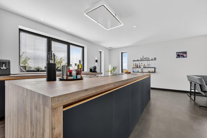 De luxe open keuken met kookeiland is uitgevoerd met hoogwaardige apparatuur en een strak design. Hier bereidt u moeiteloos zowel dagelijkse maaltijden als uitgebreide diners, terwijl u in contact blijft met uw gezelschap.
