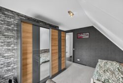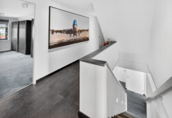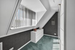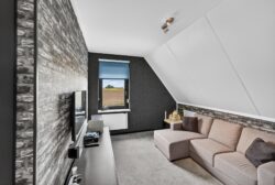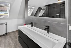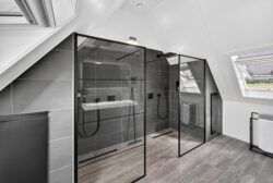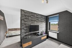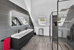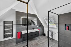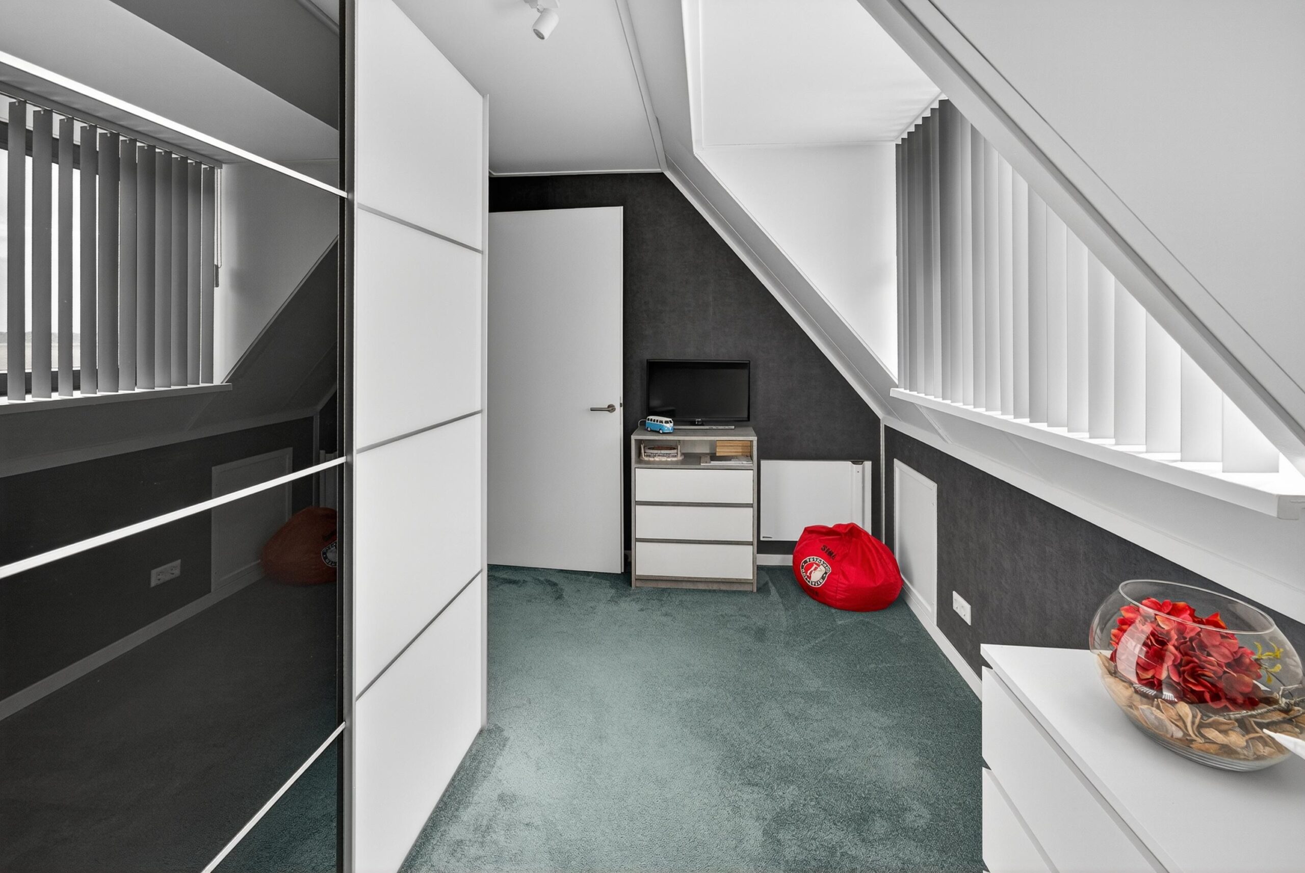 Op de eerste verdieping bevinden zich drie slaapkamers. De master bedroom is voorzien van een inloopkast, terwijl de één van de andere slaapkamers een comfortabele combinatie van slaap- en ontspanningsruimte biedt. De badkamer is een oase van rust en luxe. Stap binnen en laat u omarmen door serene ontspanning: dubbele regendouches, een dubbele wastafel met meubel, vloerverwarming en een separaat toilet maken dit tot een subliem geheel. Vanuit de overloop is via een vlizotrap de zolderverdieping bereikbaar.