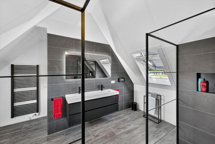 Op de eerste verdieping bevinden zich drie slaapkamers. De master bedroom met inloopkast biedt een gevoel van luxe en rust. De badkamer is stijlvol ingericht en voorzien van dubbele regendouches, een dubbele wastafel met meubel en vloerverwarming. Een separate toiletruimte verhoogt het dagelijks comfort.