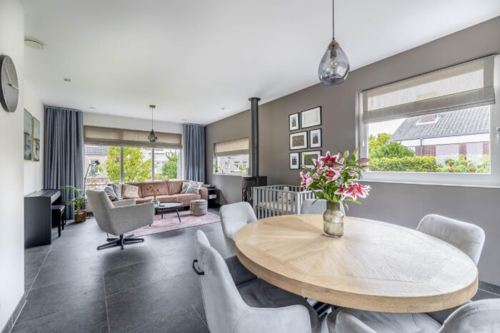 De ruime entreehal, met toilet, geeft toegang tot de woonkamer en kelder. De kelder is heerlijk koel en biedt extra opbergruimte. Diverse raampartijen in de woonkamer zorgen voor veel lichtinval en een prachtig uitzicht op de tuin. Tijdens de wintermaanden creëert de houtkachel een aangename sfeer. De open keuken, gelegen aan de achterzijde, is compleet met diverse apparatuur, zoals kookplaat, afzuigkap, oven, koelkast en vaatwasser. De glazen binnendeuren verbinden de ruimtes onderling en maken het geheel eigentijds. De gehele benedenverdieping is voorzien van vloerverwarming. Grenzend aan de keuken is de bijkeuken gesitueerd en vandaar uit is de technische ruimte toegankelijk. In de technische ruimte is de CV-ketel geplaatst en zijn witgoedaansluitingen te vinden. Vanuit de bijkeuken kom je in een zogenoemde multifunctionele ruimte. Deze ruimte kenmerkt zich door de hoogte, welke loopt tot de nok, en is volledig naar eigen wens in te richten. Het is een plek waar je de indeling, stijl en functies helemaal kunt afstemmen op jouw persoonlijke smaak en leefstijl. Denk hierbij aan een thuiskantoor, praktijkruimte aan huis of het realiseren van een extra slaapkamer op de begane grond. Genoeg opties om deze fantastische ruimte optimaal te benutten.