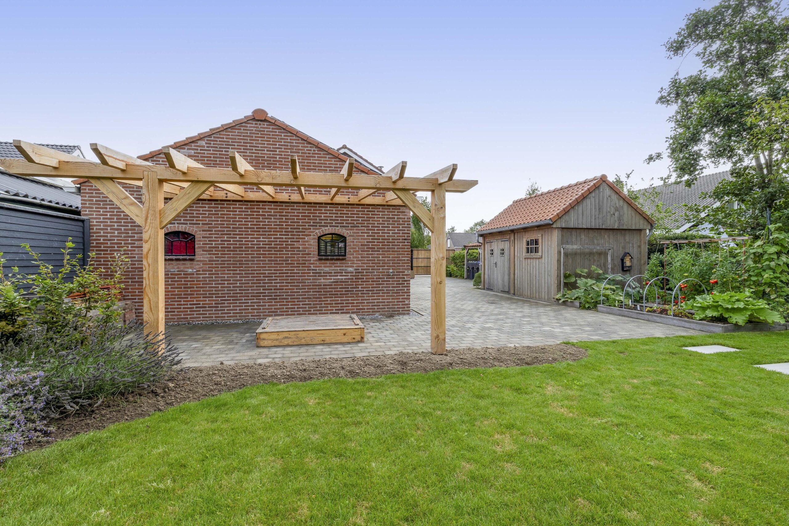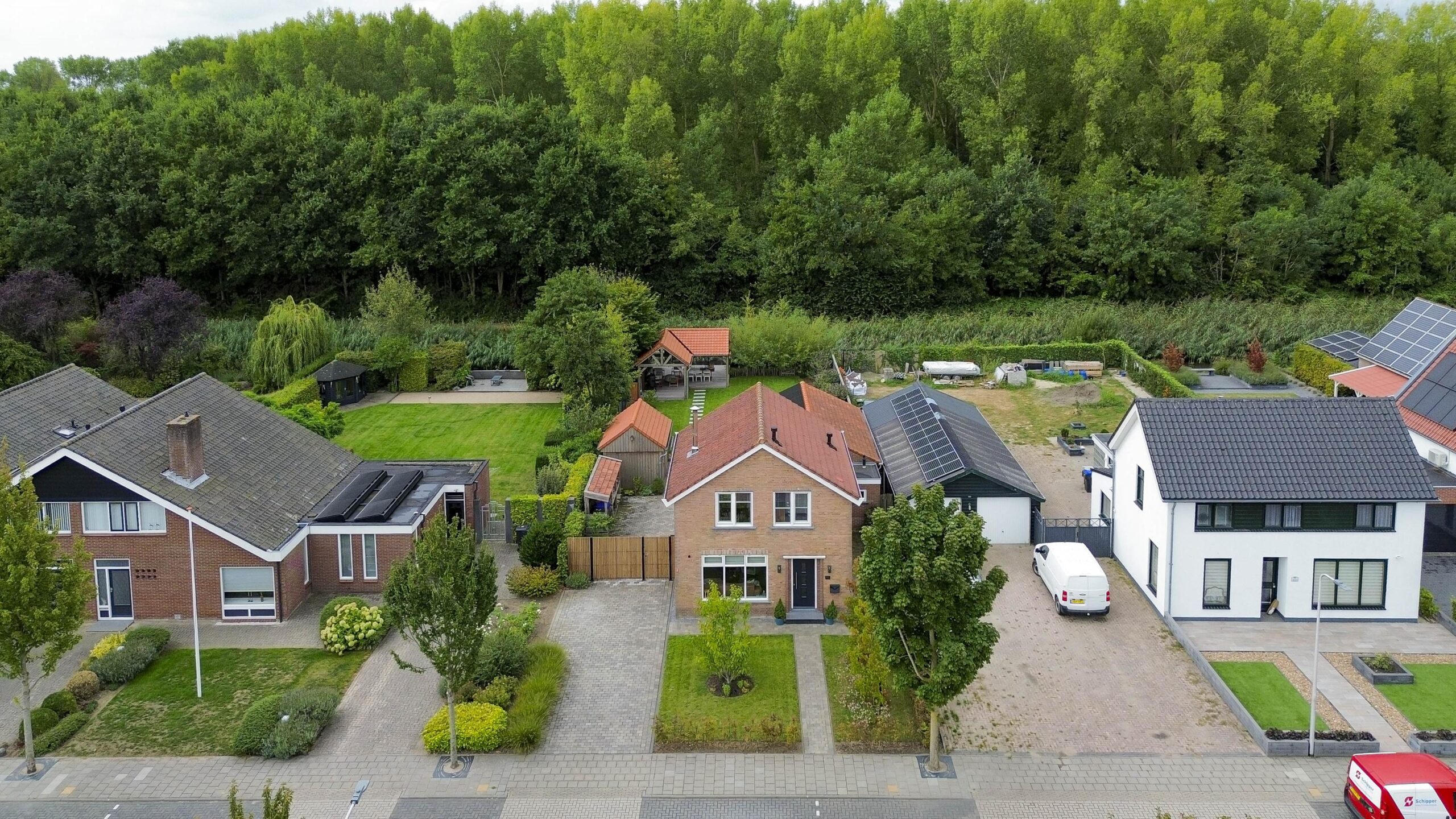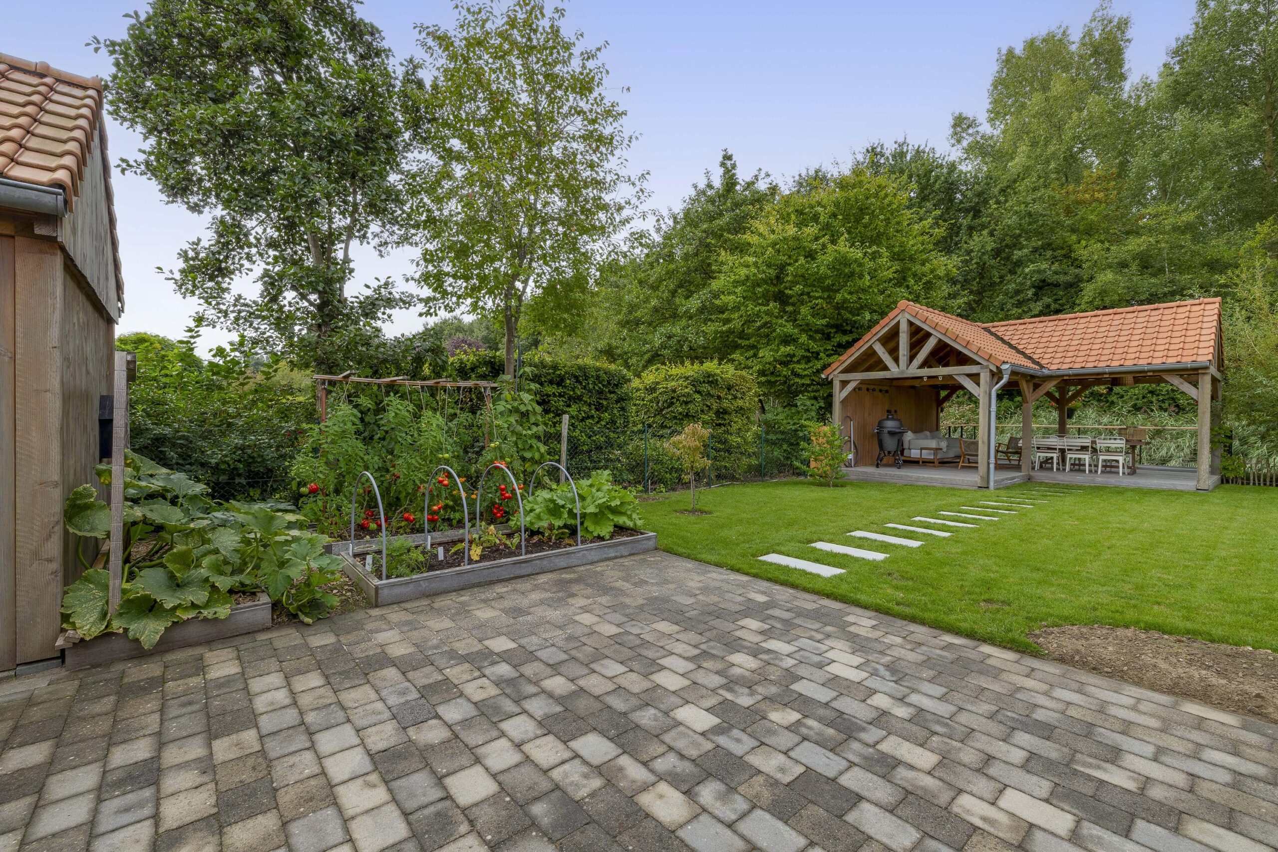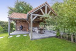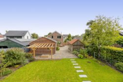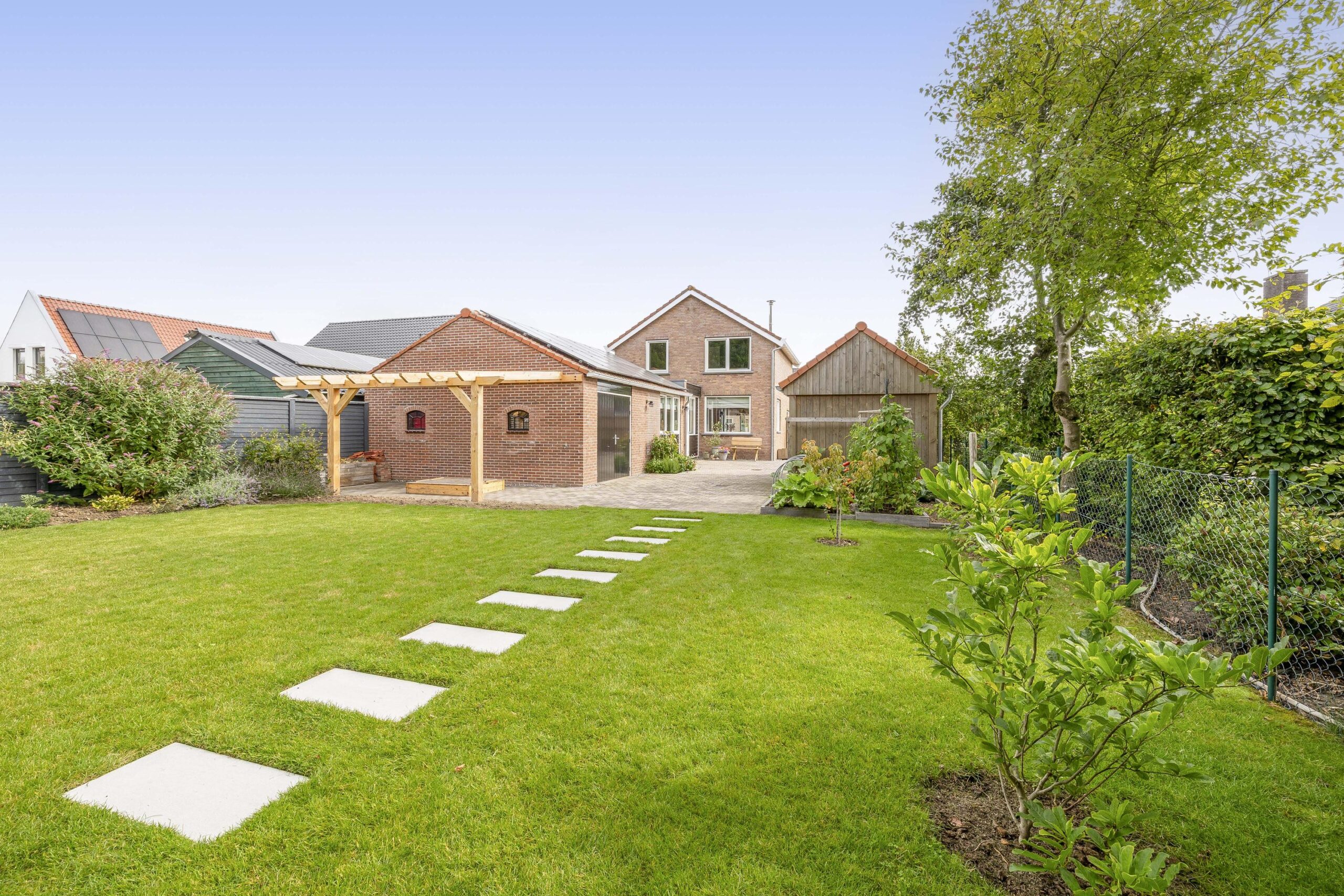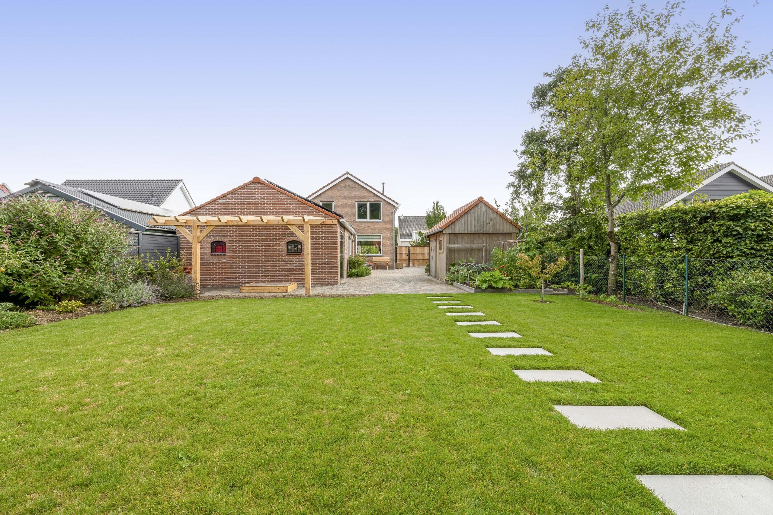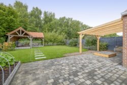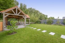 De ruime oprit geeft voldoende ruimte om je auto(‘s) op eigen terrein te parkeren. Middels een poort is de oprit afgescheiden van de zij- en achtertuin. Één van de grootste pluspunten van deze woning is de royale en goed onderhouden tuin. De achtertuin ligt op het westen en biedt voldoende ruimte voor de kinderen om te spelen, om te tuinieren, te loungen of te vertoeven in zowel klein als groot gezelschap. Bij het eerste voorjaarszonnetje kan je al lekker buiten zitten. Terwijl je ontspant in de zachte zonnestralen, wordt je getrakteerd op een vrolijk vogelconcert dat de natuur tot leven brengt. Een perfecte plek om volledig tot rust te komen en even te ontsnappen aan de dagelijkse drukte. Ben je liever actief buiten bezig en houdt je ervan om je eigen groenten en fruit te kweken? Een moestuin betekent een plek van voldoening. Achter in te tuin staat een fantastische overkapping welke grenst aan water en groen. Heerlijke avonden zijn hier gegarandeerd. Daarnaast zijn er ook een houten berging en garage beschikbaar.