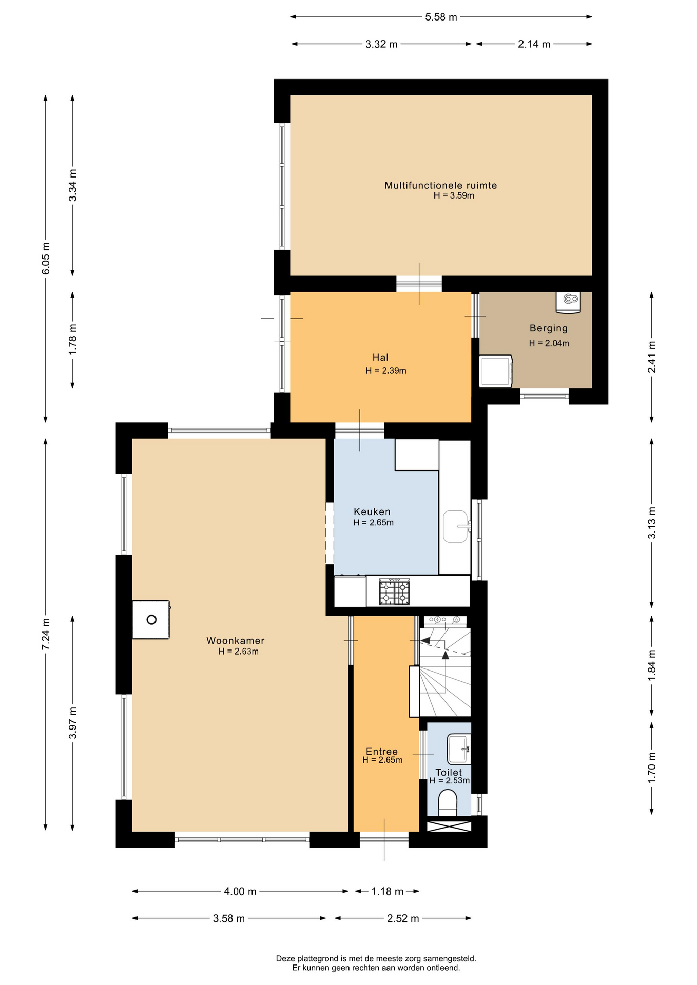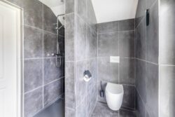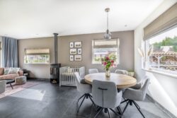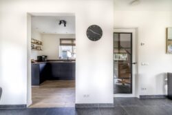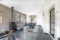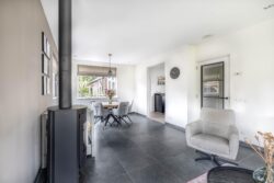 De ruime entreehal, met toilet, geeft toegang tot de woonkamer en kelder. De kelder is heerlijk koel en biedt extra opbergruimte. Diverse raampartijen in de woonkamer zorgen voor veel lichtinval en een prachtig uitzicht op de tuin. Tijdens de wintermaanden creëert de houtkachel een aangename sfeer. De open keuken, gelegen aan de achterzijde, is compleet met diverse apparatuur, zoals kookplaat, afzuigkap, oven, koelkast en vaatwasser. De glazen binnendeuren verbinden de ruimtes onderling en maken het geheel eigentijds. De gehele benedenverdieping is voorzien van vloerverwarming. Grenzend aan de keuken is de bijkeuken gesitueerd en vandaar uit is de technische ruimte toegankelijk. In de technische ruimte is de CV-ketel geplaatst en zijn witgoedaansluitingen te vinden. Vanuit de bijkeuken kom je in een zogenoemde multifunctionele ruimte. Deze ruimte kenmerkt zich door de hoogte, welke loopt tot de nok, en is volledig naar eigen wens in te richten. Het is een plek waar je de indeling, stijl en functies helemaal kunt afstemmen op jouw persoonlijke smaak en leefstijl. Denk hierbij aan een thuiskantoor, praktijkruimte aan huis of het realiseren van een extra slaapkamer op de begane grond. Genoeg opties om deze fantastische ruimte optimaal te benutten.