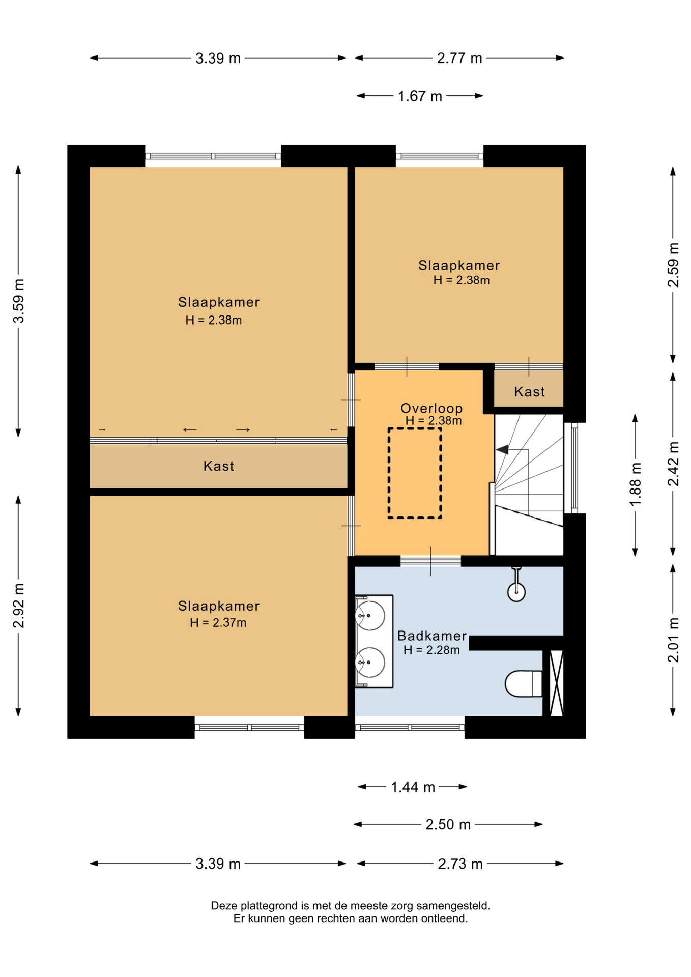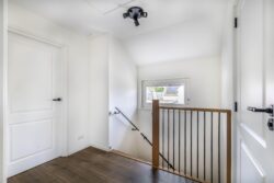 De eikenhouten trap vormt een echte eyecatcher in de woning en brengt warmte en karakter in het interieur. Middels deze trap bereik je de eerste verdieping. De verdieping is voorzien van drie gezellige slaapkamers, welke comfortabel en licht zijn te noemen. De master bedroom beschikt over een inbouwkast. De badkamer is geheel betegeld en compleet met inloopdouche met regendouche, dubbele wastafel en wastafelmeubel, toilet en designradiator. Ook is er in de badkamer vloerverwarming aanwezig. Vanaf de overloop is via een vlizotrap de vliering bereikbaar.