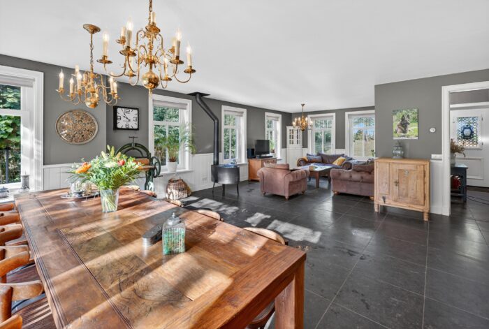 De woonkamer is een plek waar licht en natuur elkaar ontmoeten. Grote raampartijen bieden een fraai uitzicht over de verzorgde tuin, terwijl openslaande deuren de grens tussen binnen en buiten vervagen. Op frisse winterdagen schenkt de houtkachel warmte en sfeer.