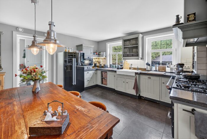 De landelijke keuken is ruim, volledig uitgerust en nodigt uit tot gezellig koken en samenkomen. Het Falcon Elan gasfornuis met maar liefst vier ovens is een musthave voor de hobbykok. Via de bijkeuken loopt u gemakkelijk naar het buitenterras, ideaal voor een ontbijt in de ochtendzon of een diner onder de sterren.