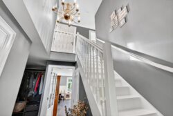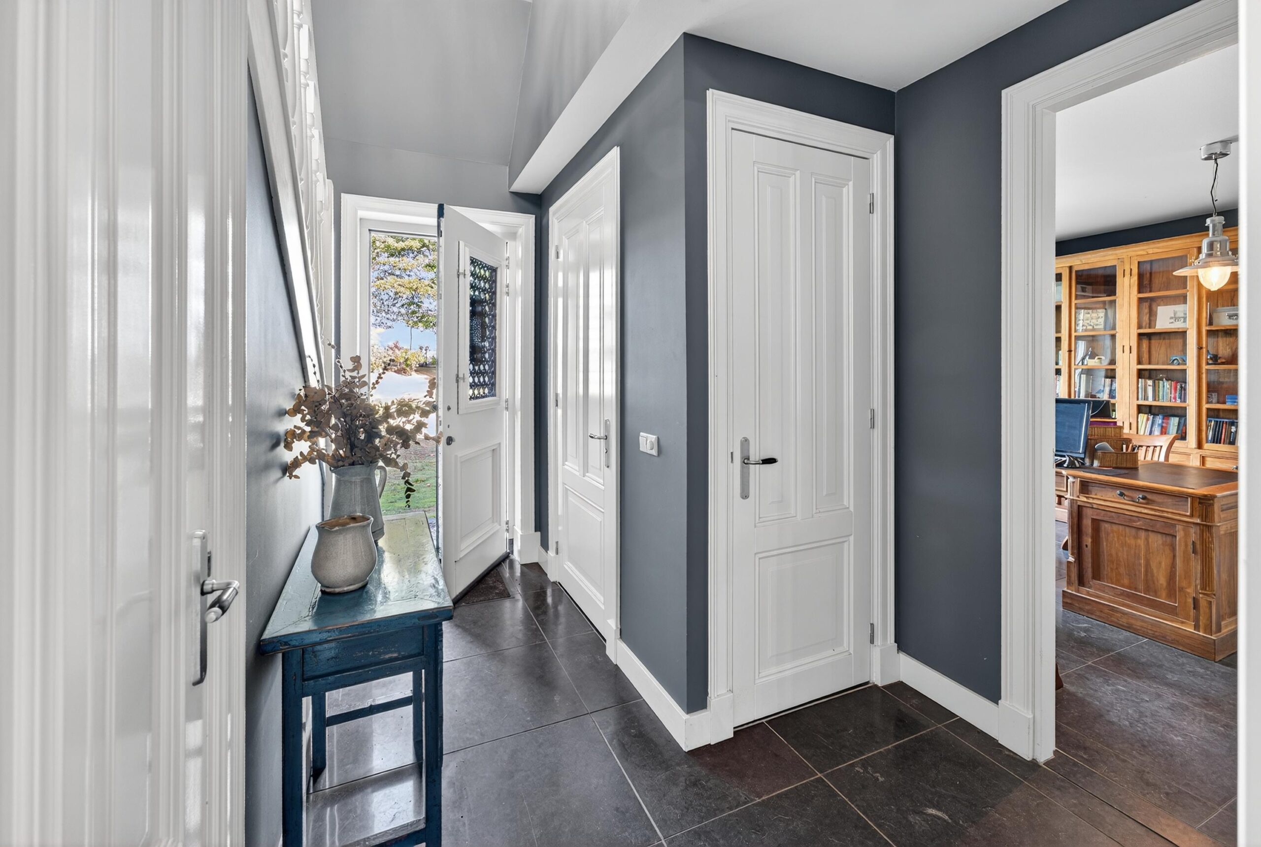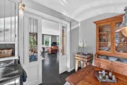 De oprijlaan en toegangspoort geven al een gevoel van allure en vrijheid bij aankomst. Binnen wordt u verwelkomd door een lichte, royale entreehal die toegang biedt tot de woonkamer en het kantoor. De hardstenen vloer met vloerverwarming zorgt voor een aangename basis in het hele huis.