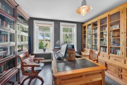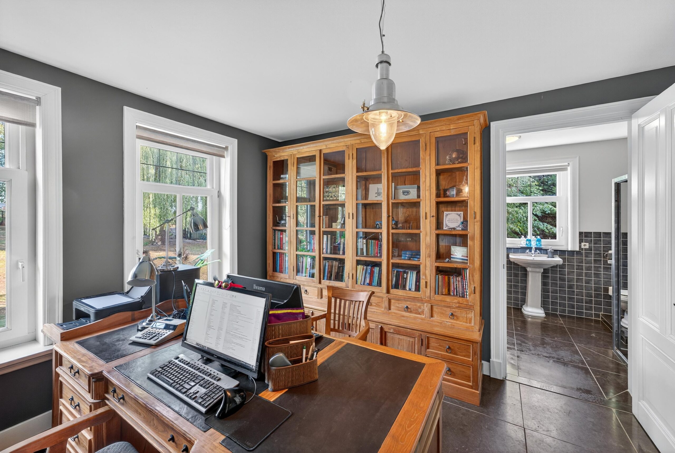 Het kantoor, met knusse haard en een zitje, biedt een rustige werkplek, grenzend aan de badkamer met sauna. Hier vindt u een eigen plek voor ontspanning en welzijn, waar u de drukte van alledag moeiteloos achter u laat.