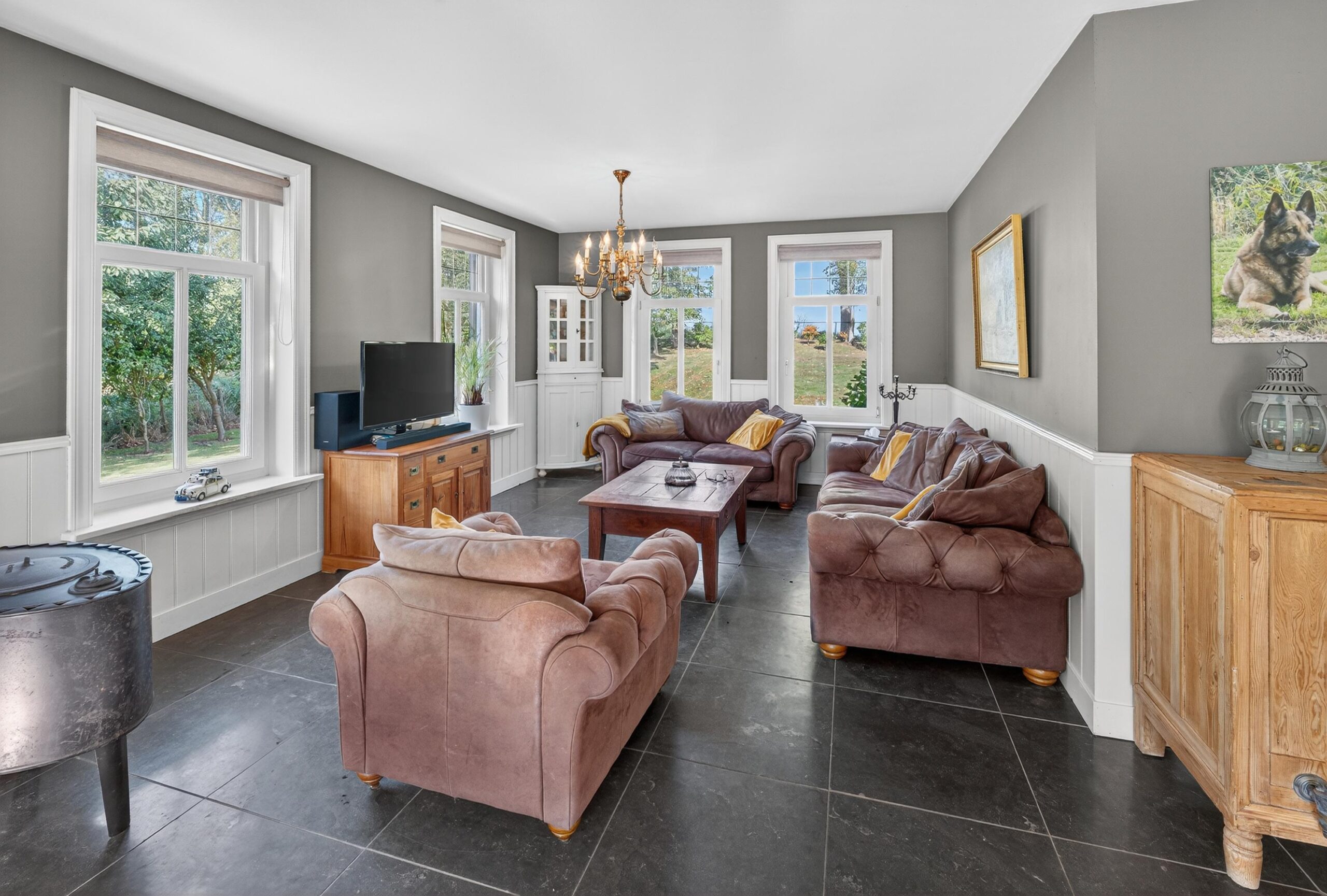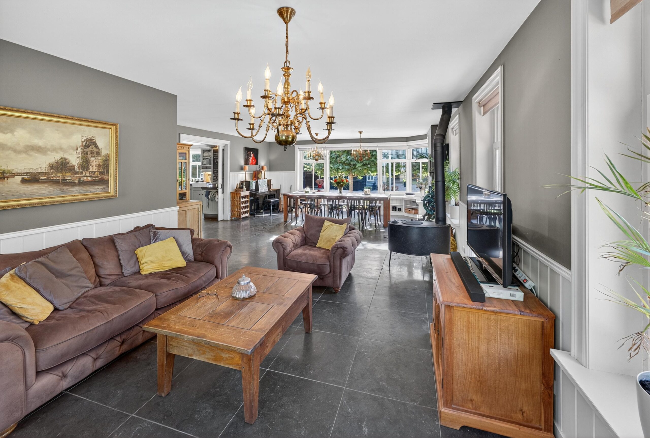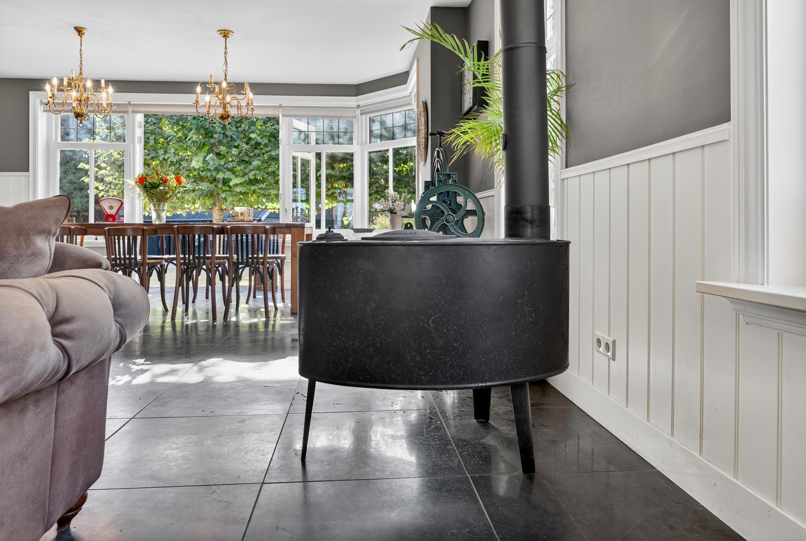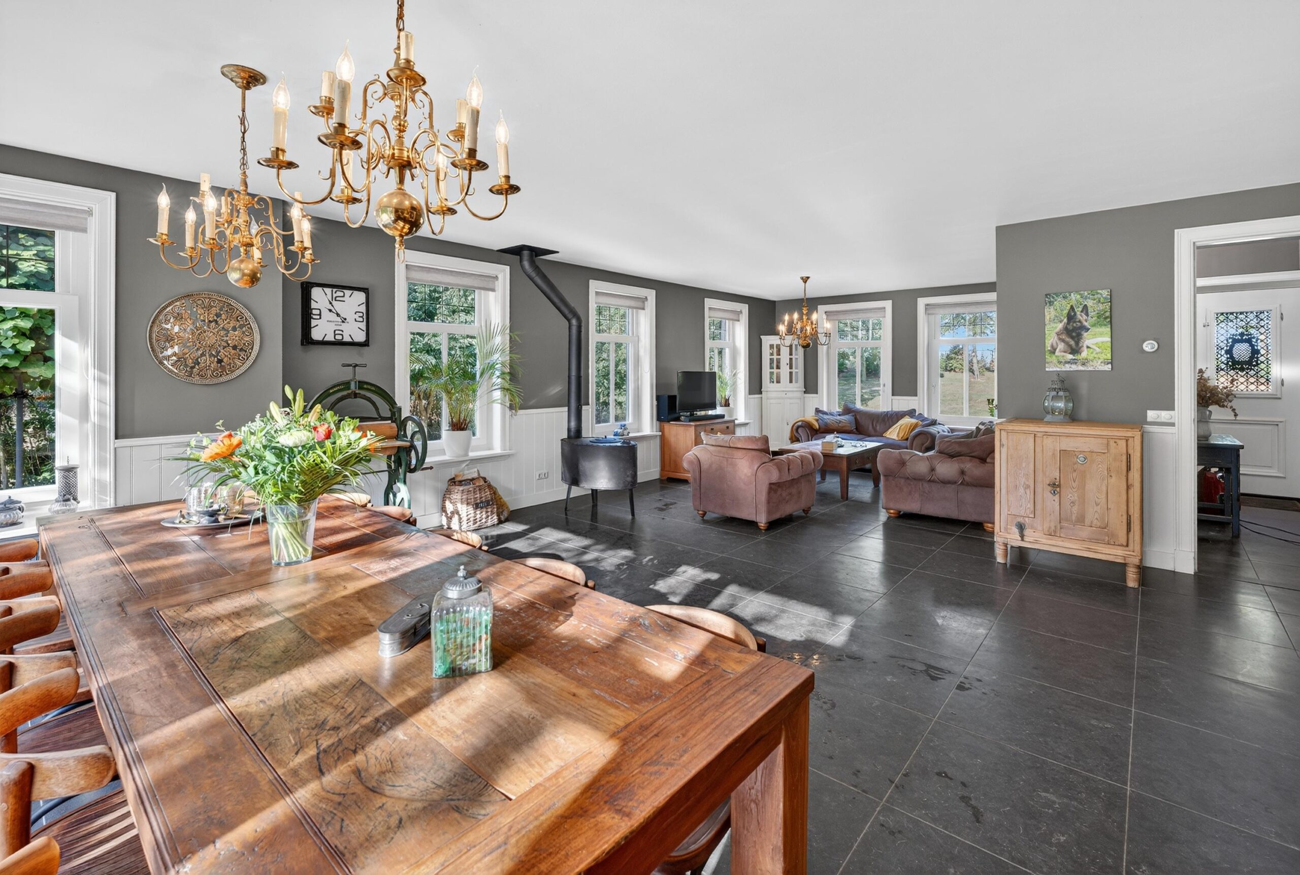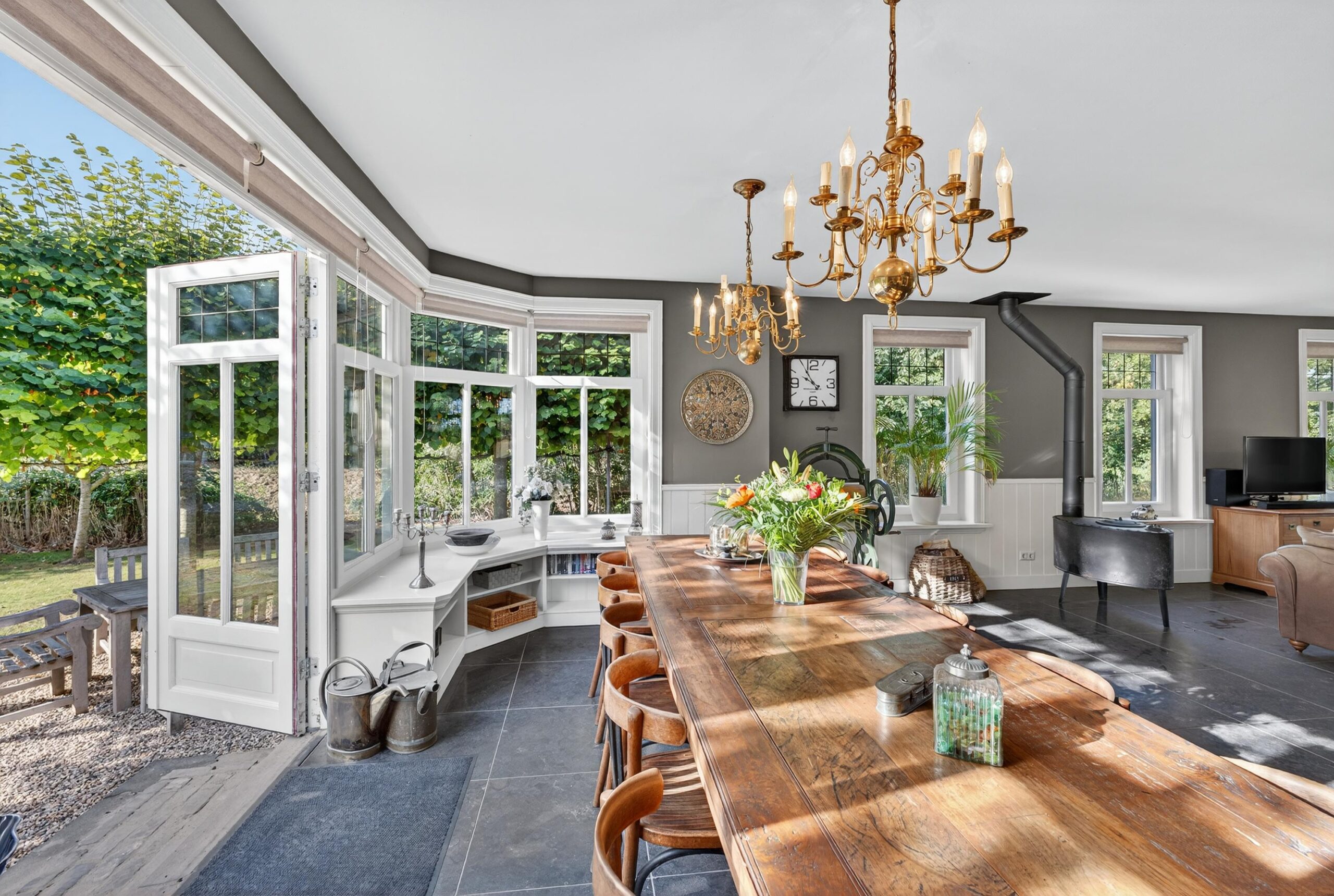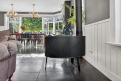 De woonkamer is een plek waar licht en natuur elkaar ontmoeten. Grote raampartijen bieden een fraai uitzicht over de verzorgde tuin, terwijl openslaande deuren de grens tussen binnen en buiten vervagen. Op frisse winterdagen schenkt de houtkachel warmte en sfeer.