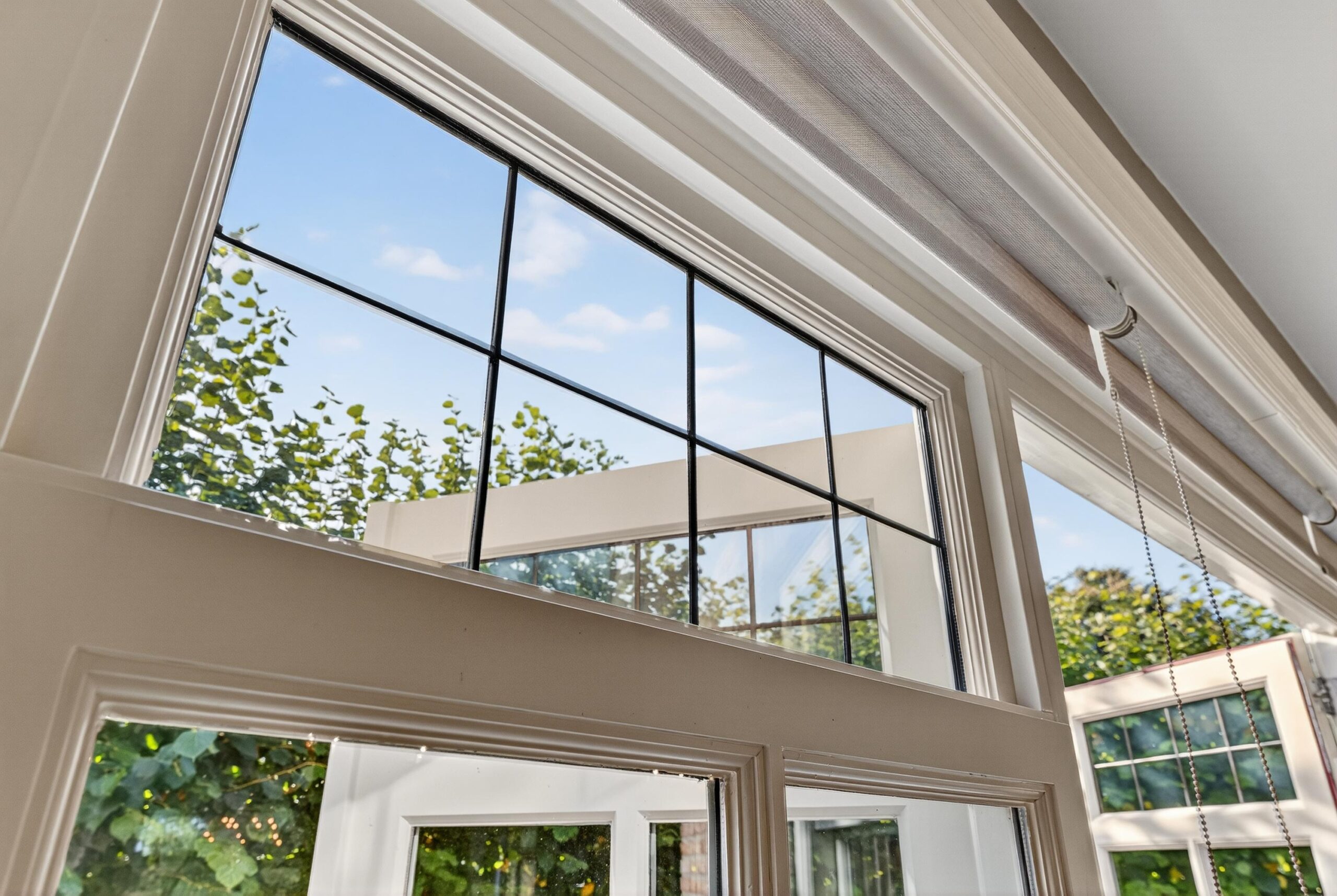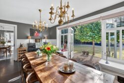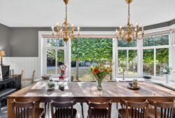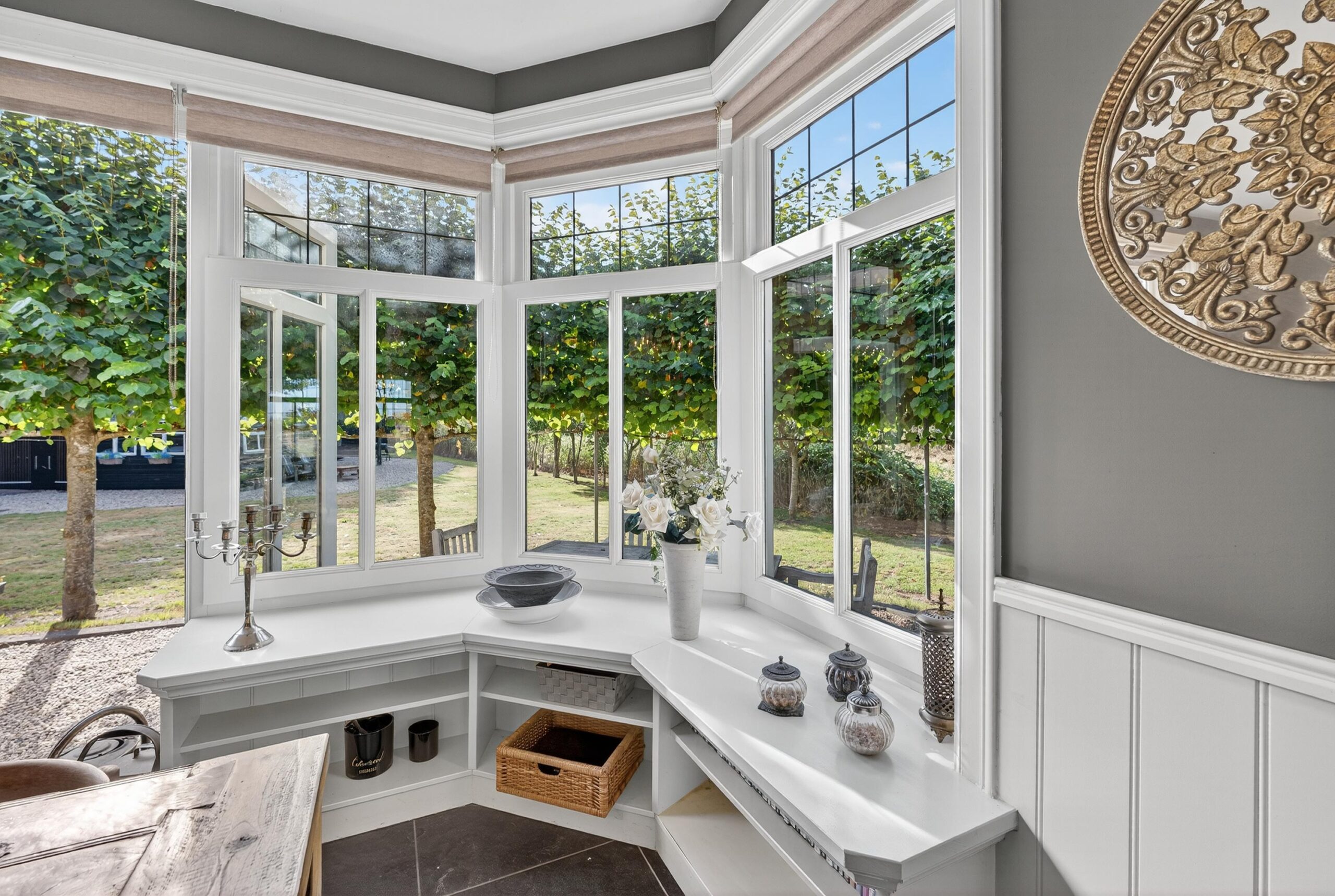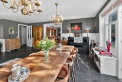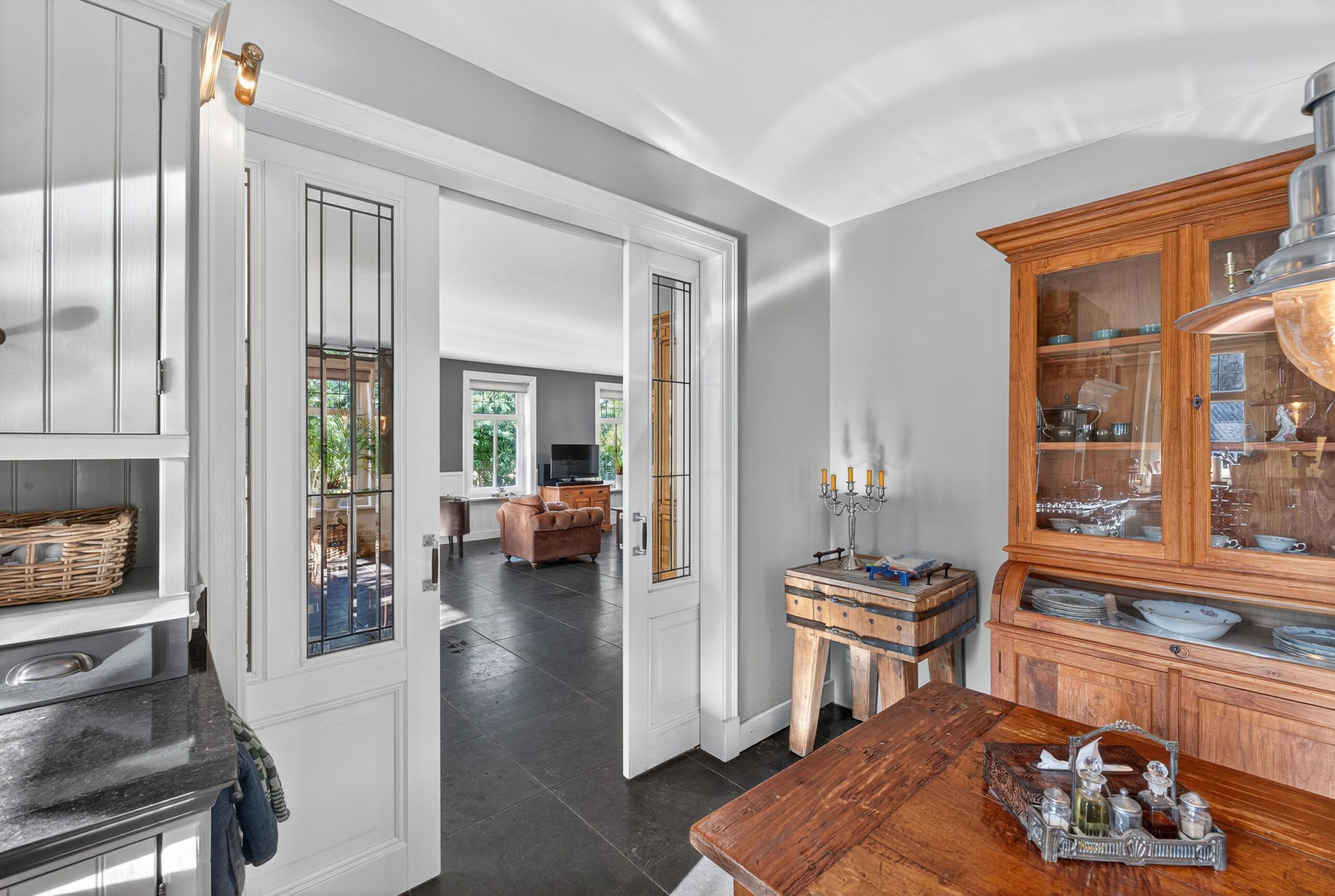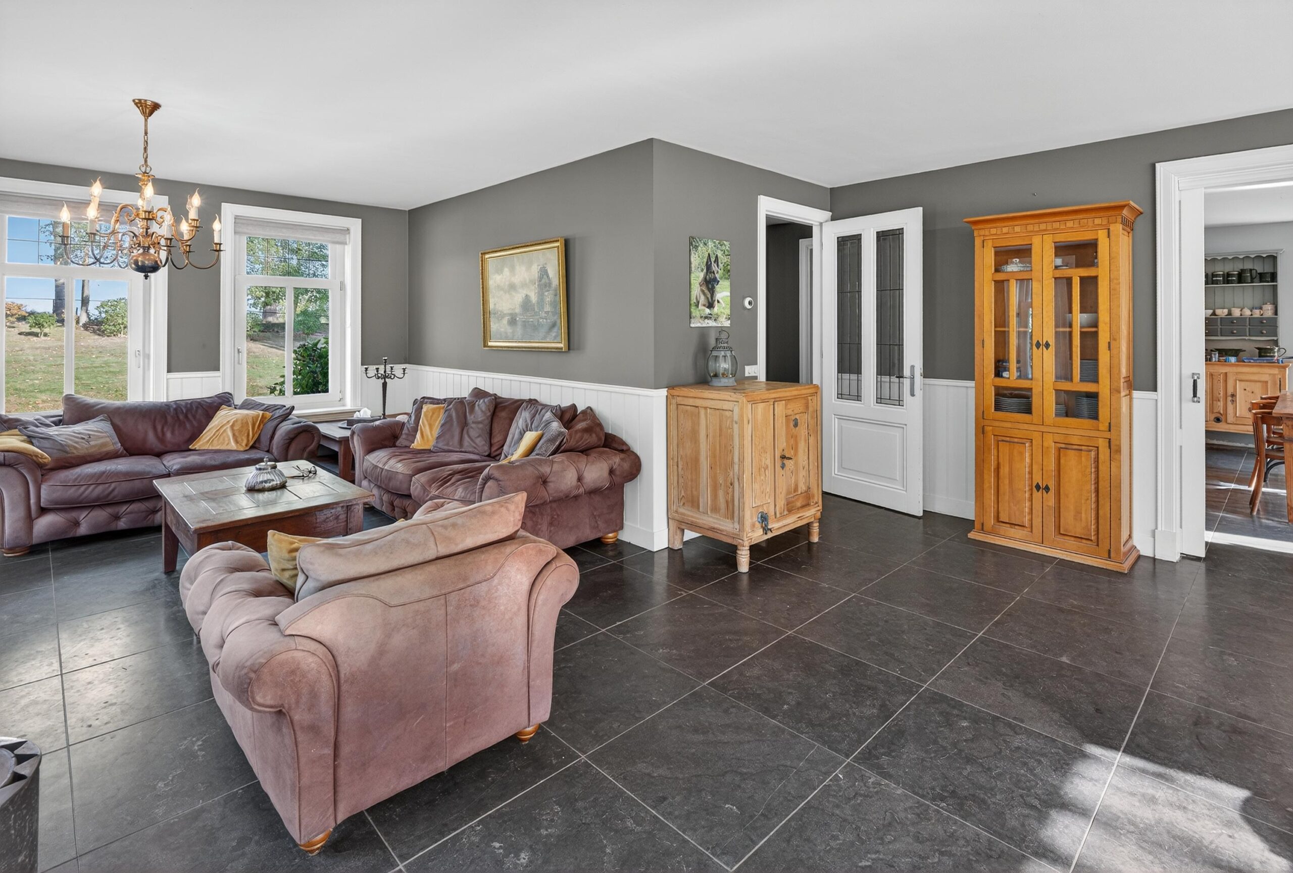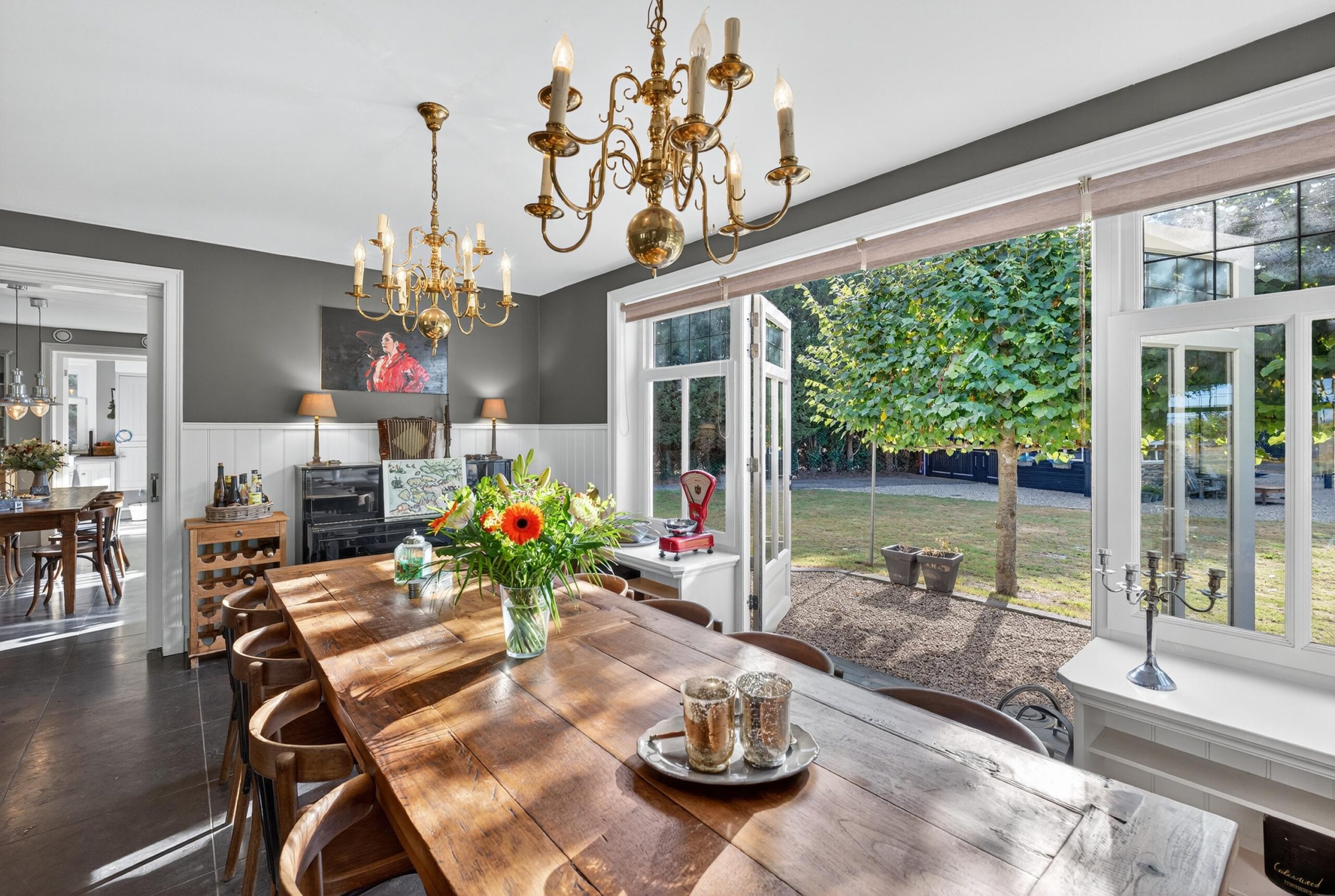 De woonkamer is een plek waar licht en natuur elkaar ontmoeten. Grote raampartijen bieden een fraai uitzicht over de verzorgde tuin, terwijl openslaande deuren de grens tussen binnen en buiten vervagen. Op frisse winterdagen schenkt de houtkachel warmte en sfeer.