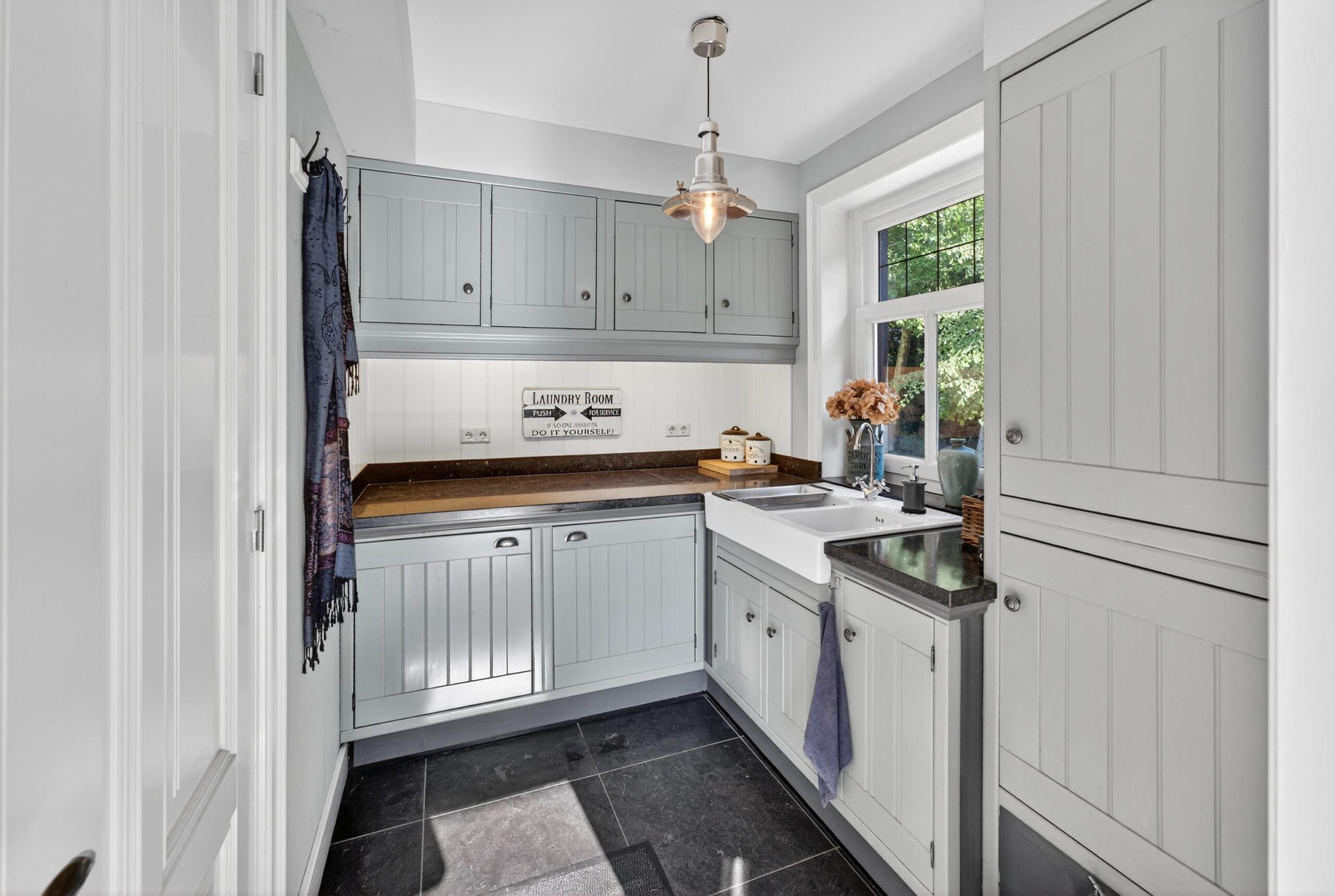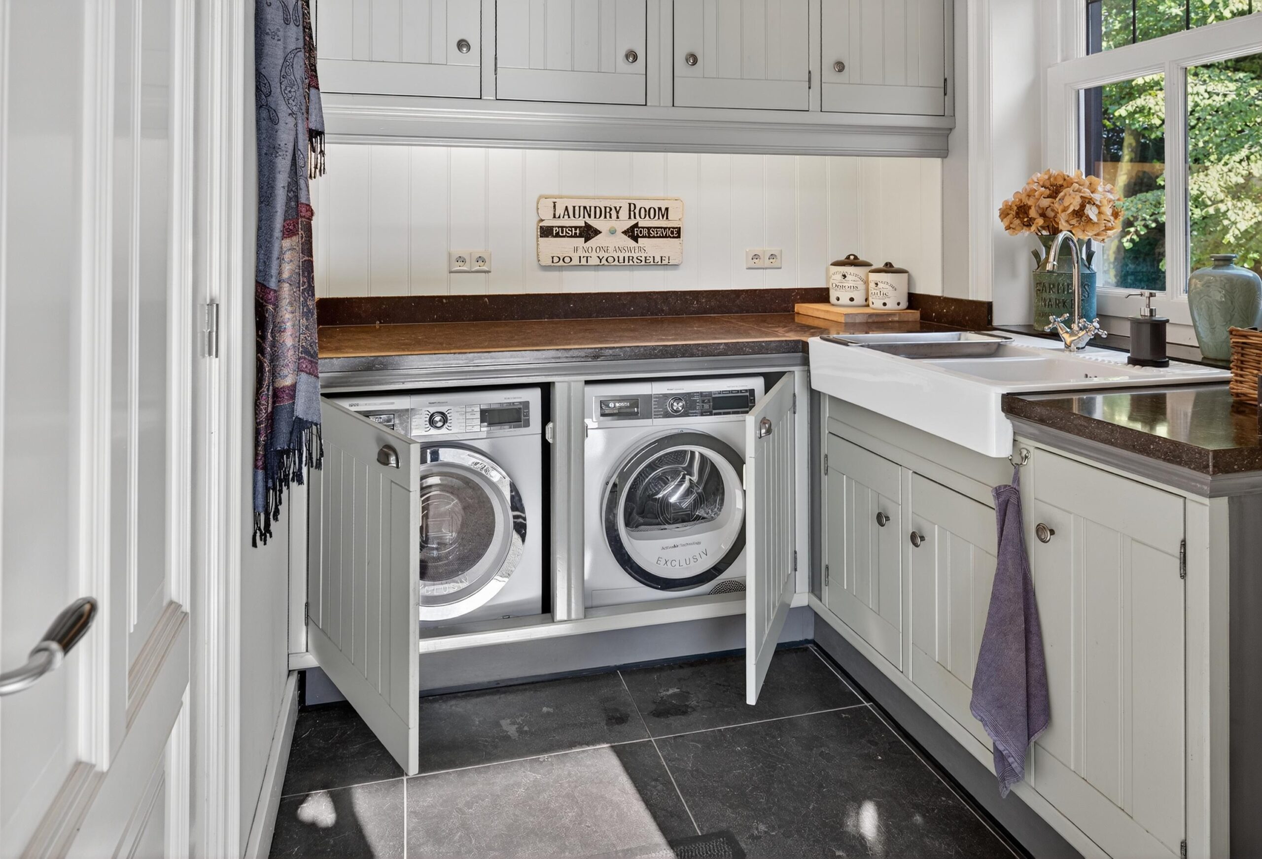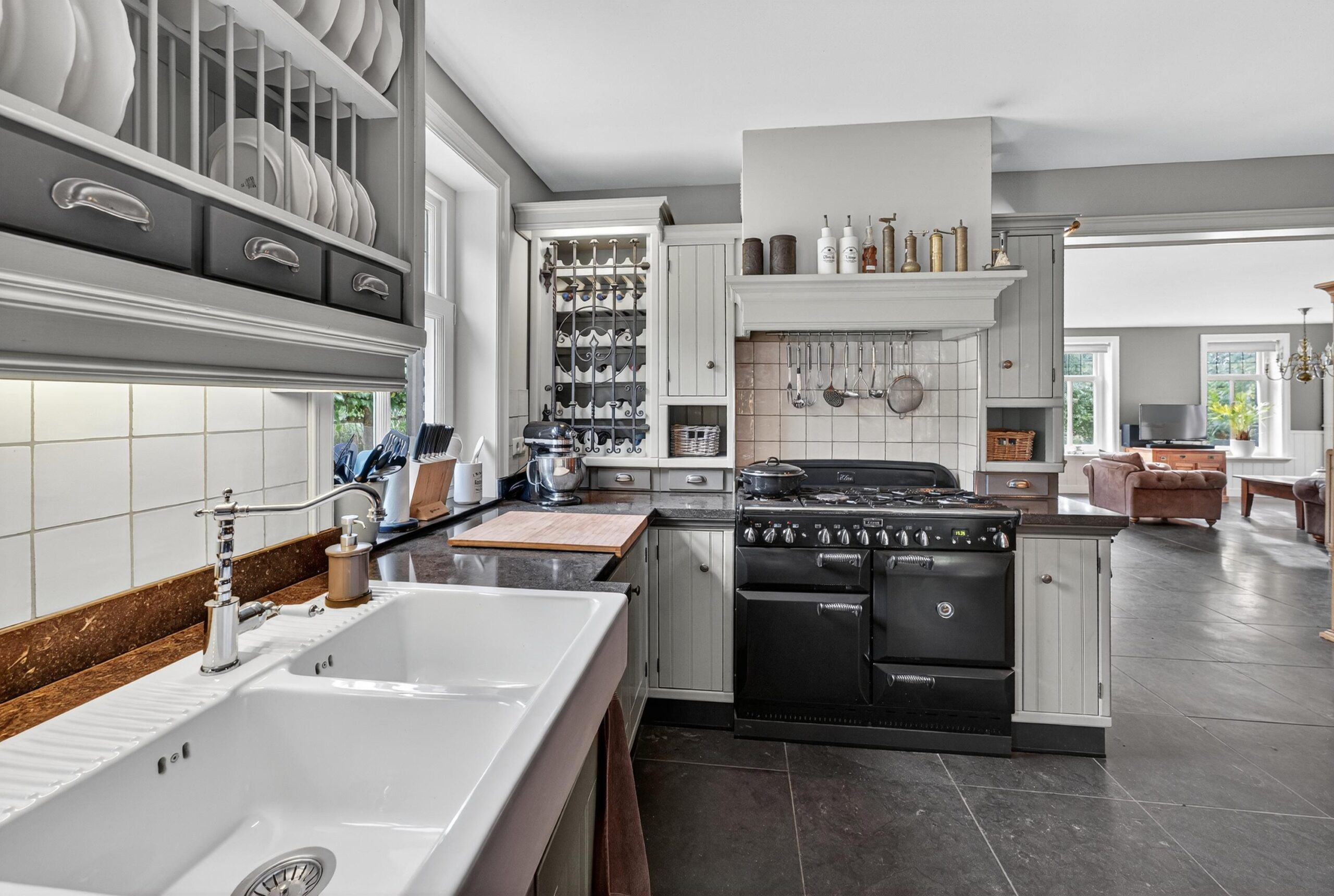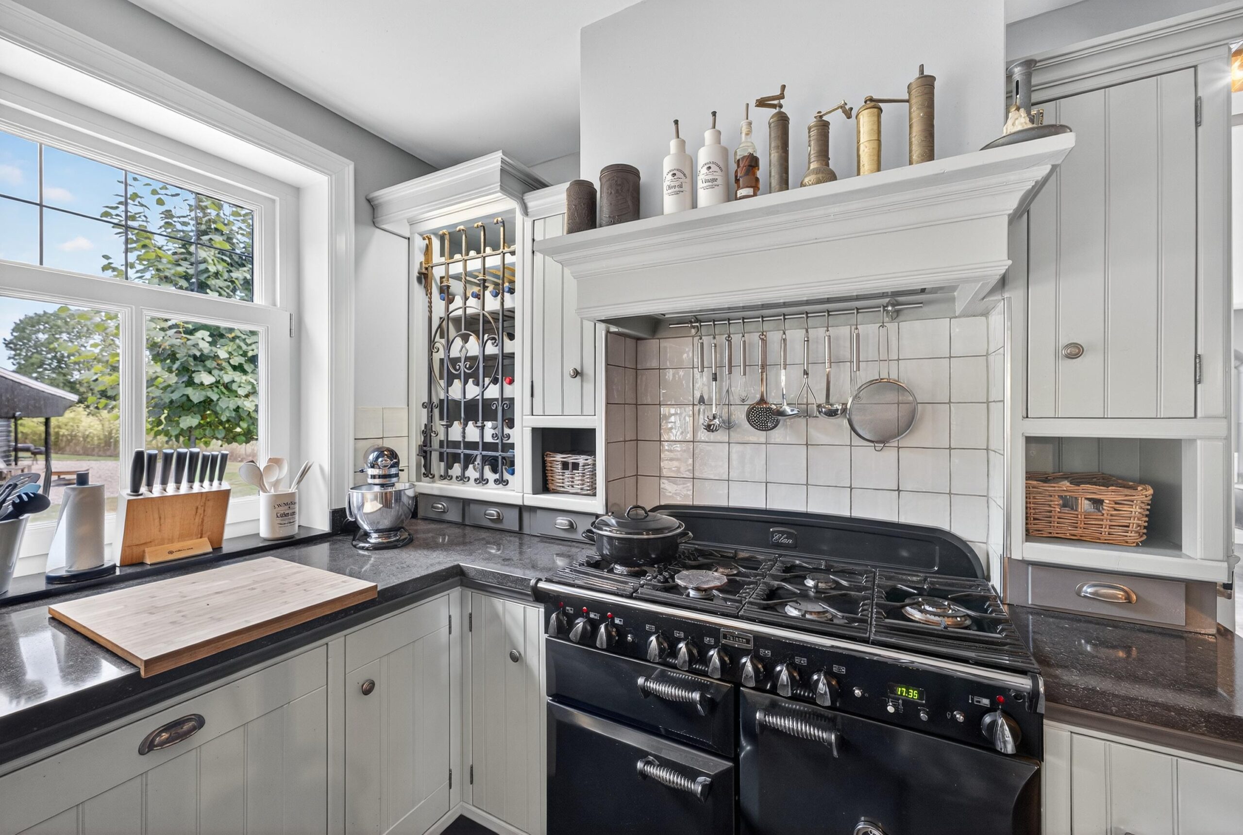 De landelijke keuken is ruim, volledig uitgerust en nodigt uit tot gezellig koken en samenkomen. Het Falcon Elan gasfornuis met maar liefst vier ovens is een musthave voor de hobbykok. Via de bijkeuken loopt u gemakkelijk naar het buitenterras, ideaal voor een ontbijt in de ochtendzon of een diner onder de sterren.