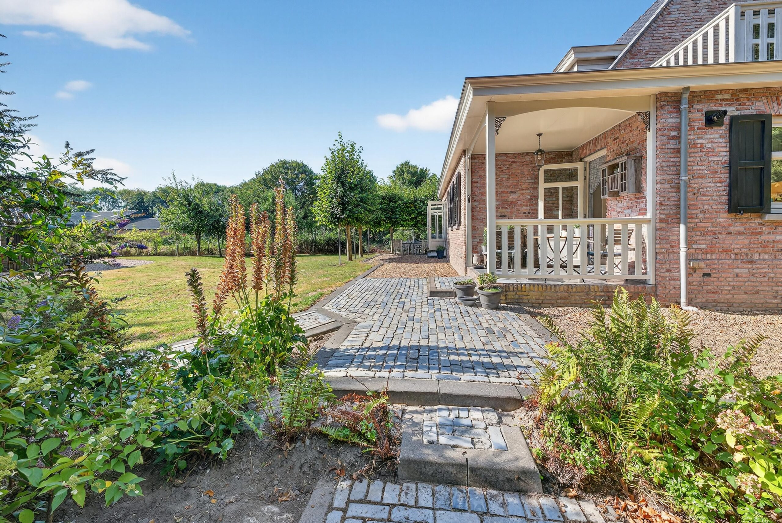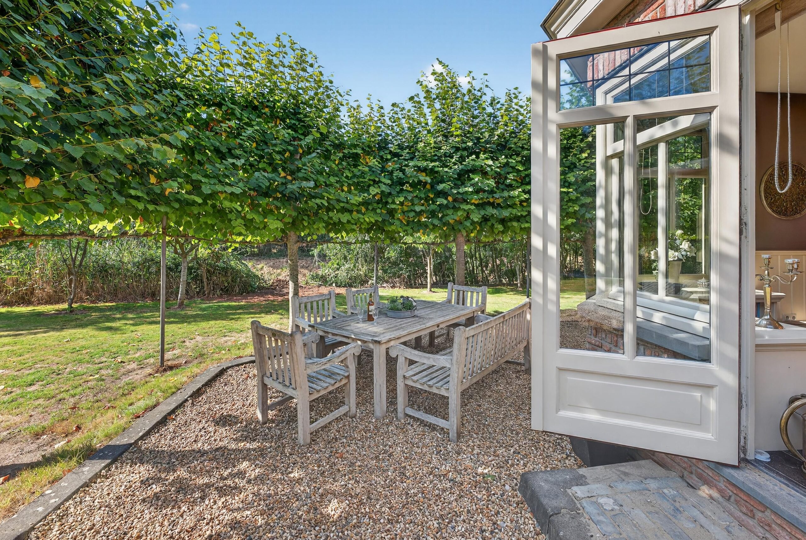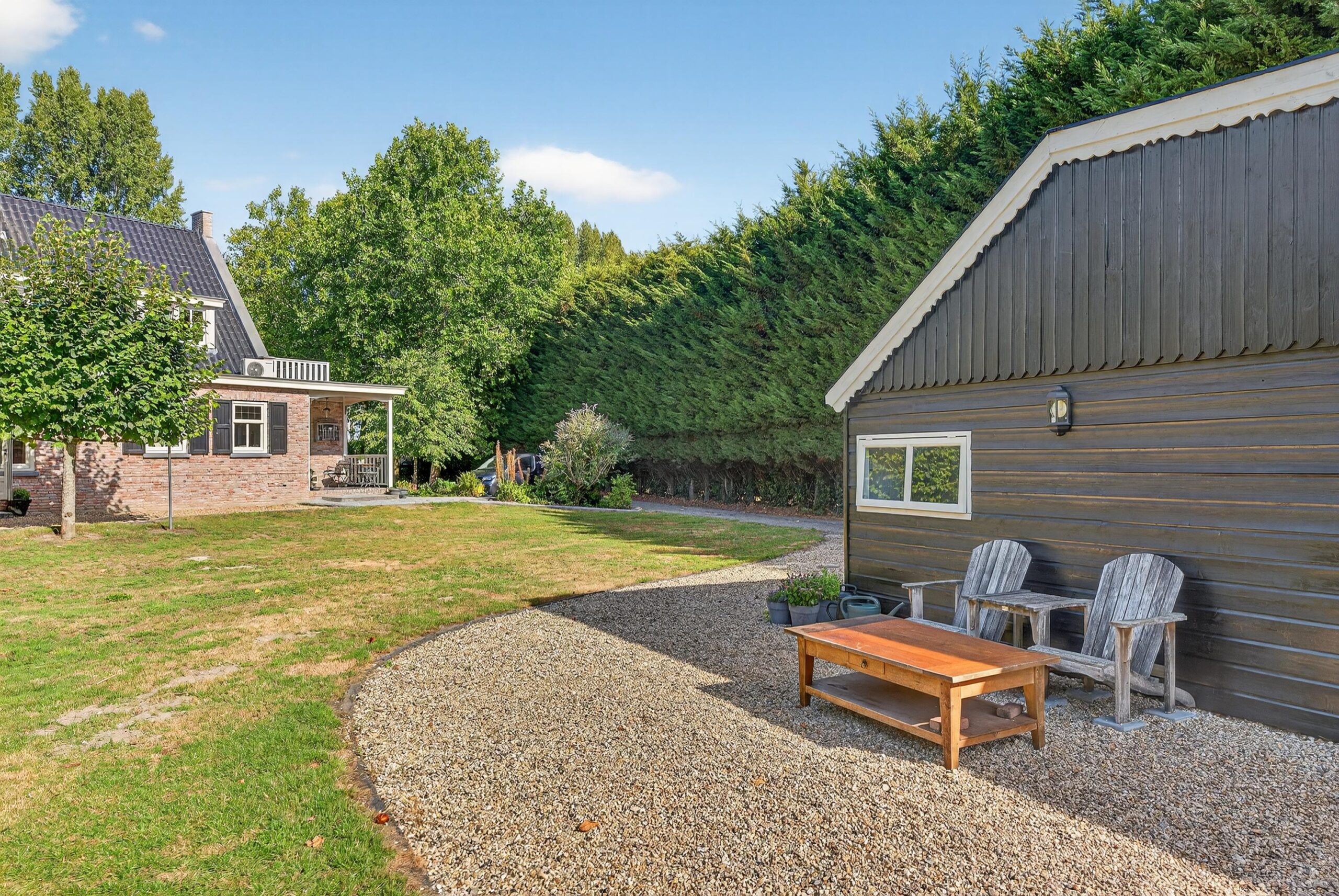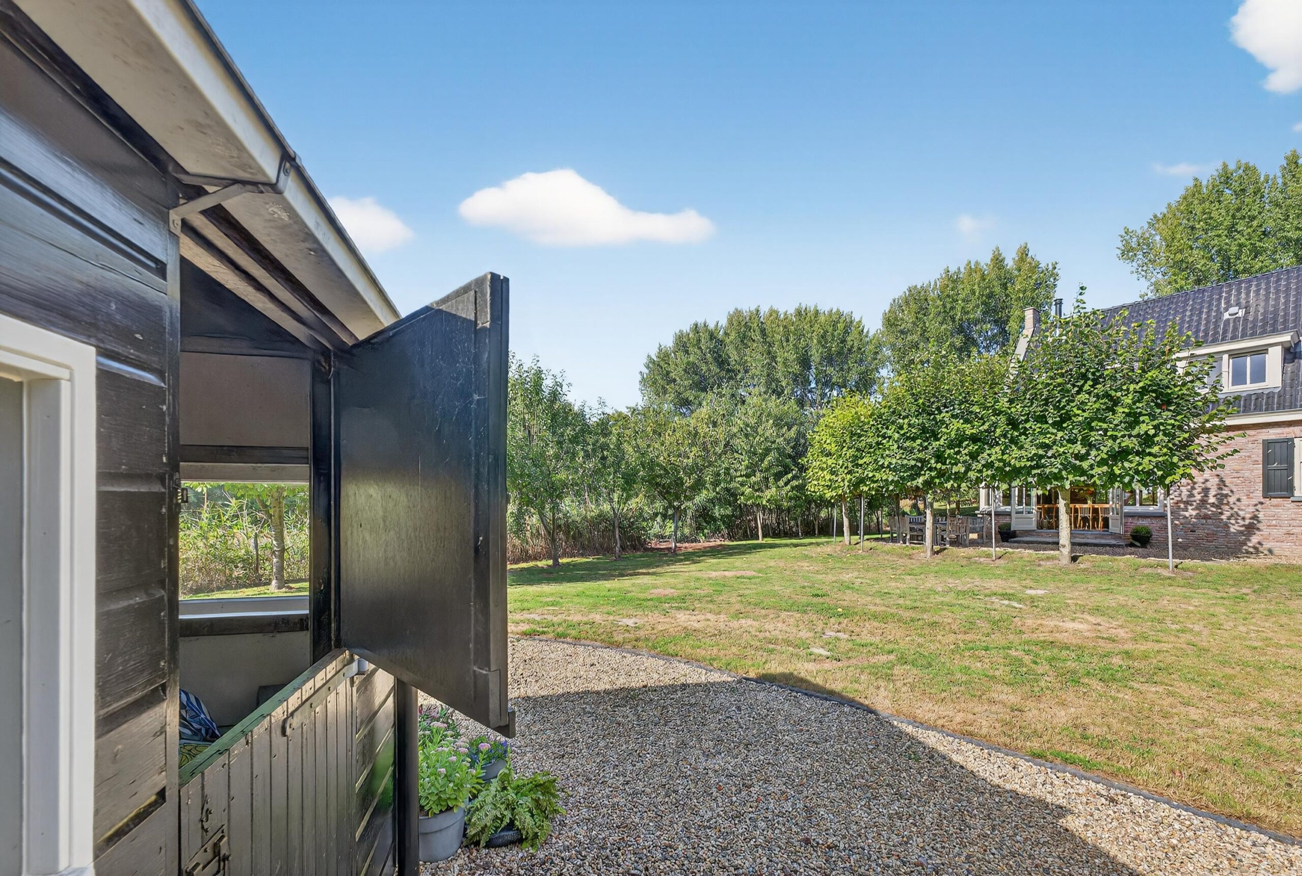 Het perceel van 3.275 m² is een ware buitenoase. De tuin is zorgvuldig aangelegd en biedt volop ruimte voor ontspanning, spel en vrije tijd in de natuur. Hier ervaart u totale privacy en rust, omgeven door groen. Diverse terrassen nodigen uit tot lange zomerse dagen en gezellige avonden. De stenen schuur/garage met de mooie buitenkamer voegt functionaliteit en charme toe, ideaal voor opslag of creatieve projecten. Wanneer de zomer nadert, hangen de volwassen fruitbomen vol vruchten: appels die blinken in het zonlicht, peren die hun elegante vormen tonen, kersen die als kleine juwelen schitteren. Het is alsof de bomen gul hun schatten aanbieden, om je te herinneren aan de overvloed van de natuur.