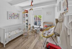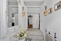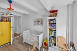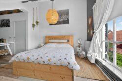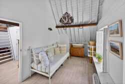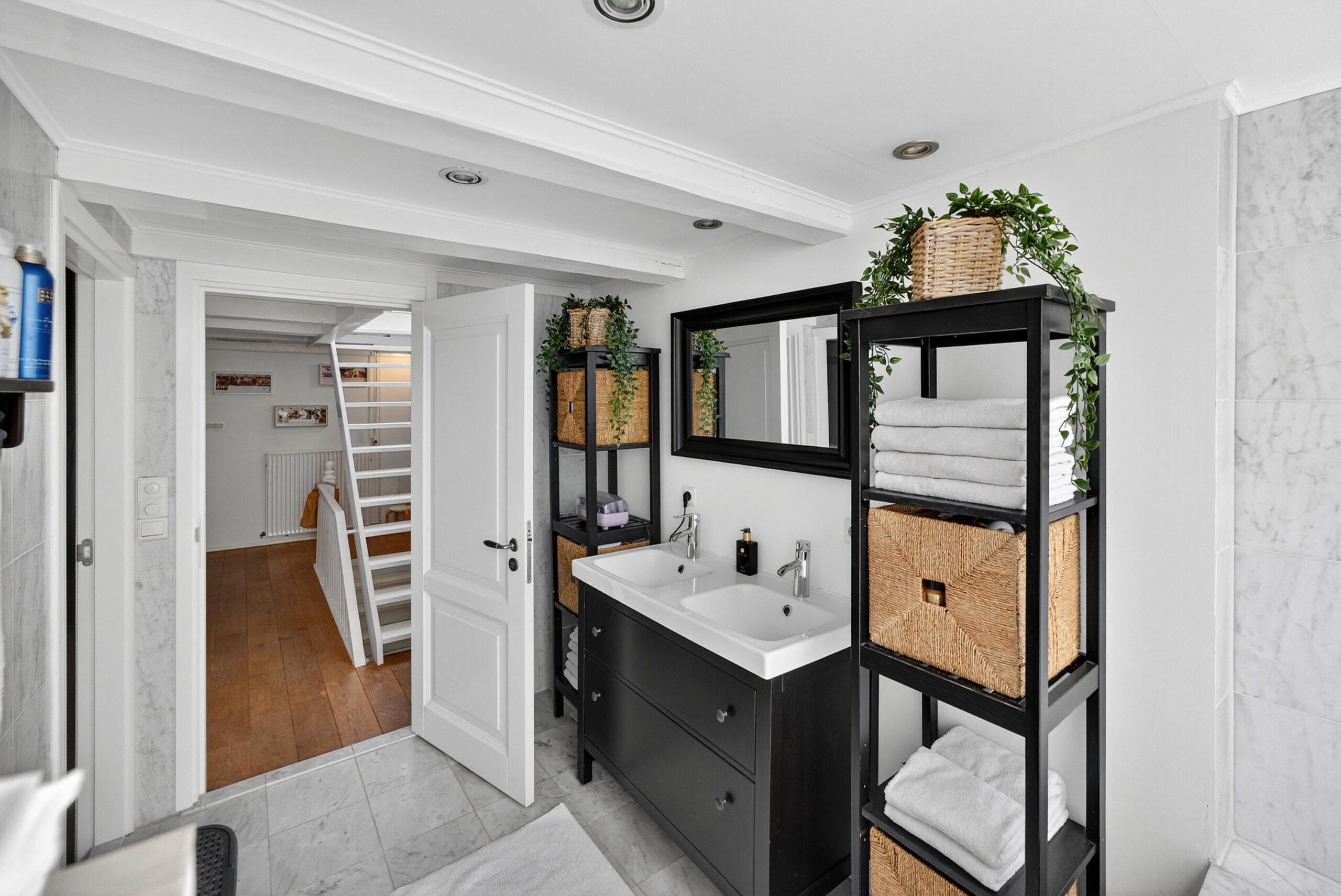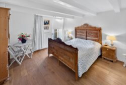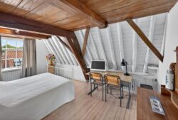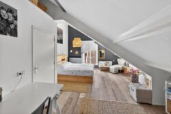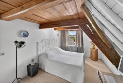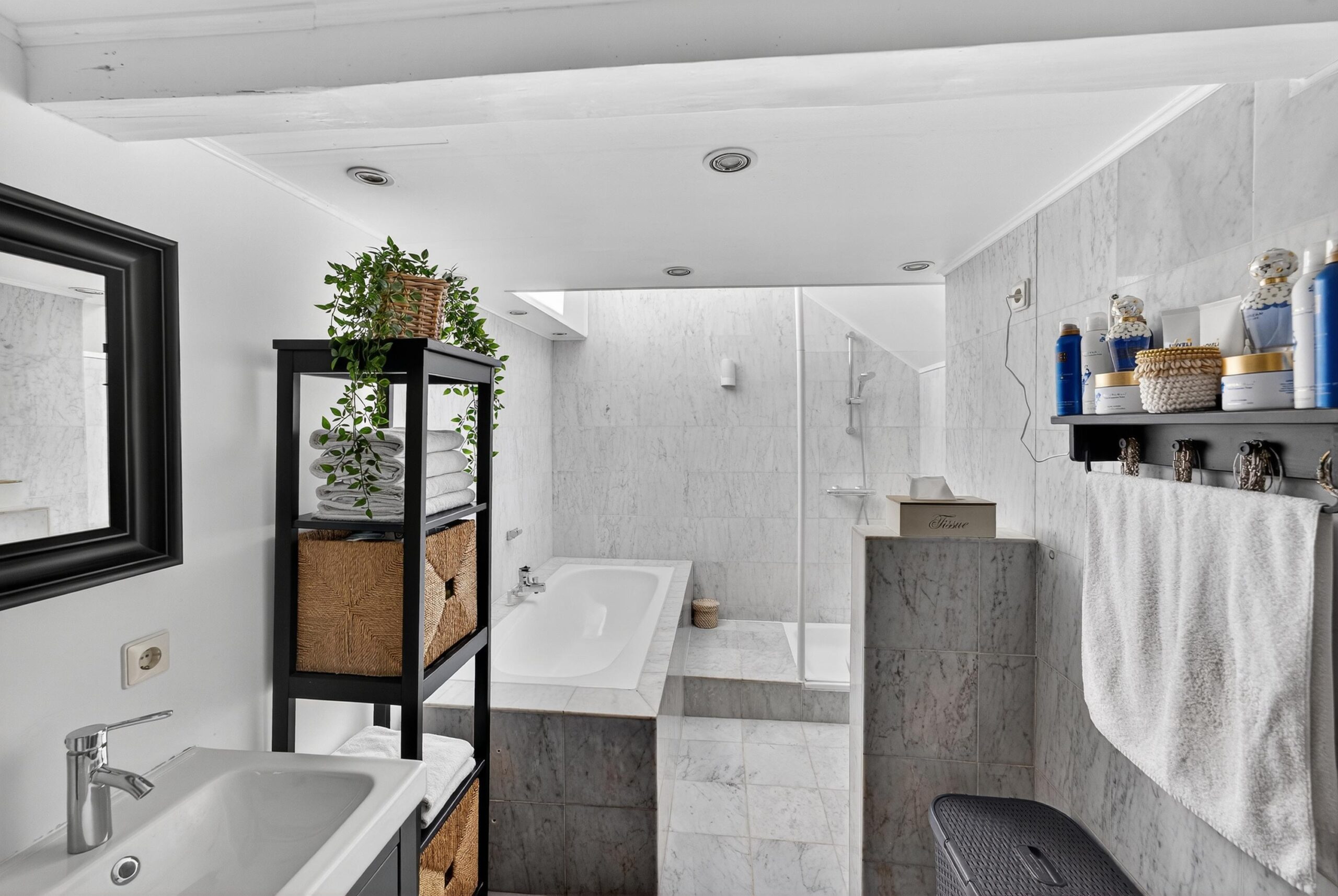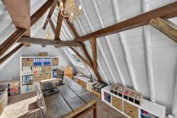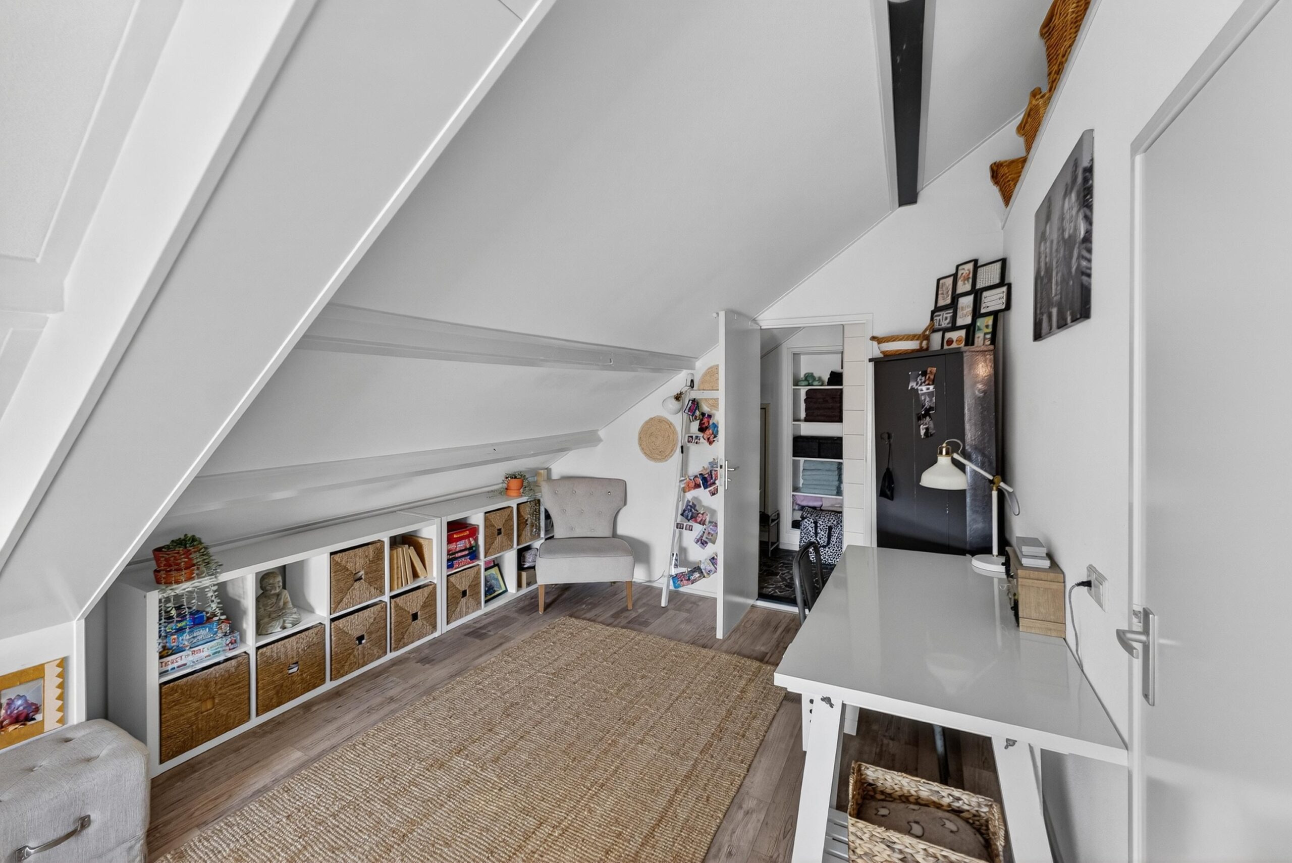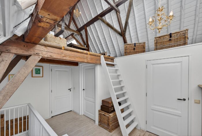 Een vaste trap leidt naar de tweede verdieping, waar nog eens twee verrassend sfeervolle slaapkamers en een inloopkast wachten. Het zichtbare hout van de balken geeft de kamers een natuurlijke, warme uitstraling. Vanaf de overloop bereikt u een vide, momenteel ingericht als kantoorruimte – een charmante werkplek hoog in de nok van het huis. Ook op deze verdieping vindt u een badkamer, compleet met inloopdouche, toilet en wastafelmeubel. De granieten vloer zorgt voor een luxe, spa-achtige sfeer en maakt het geheel af.