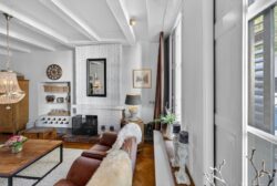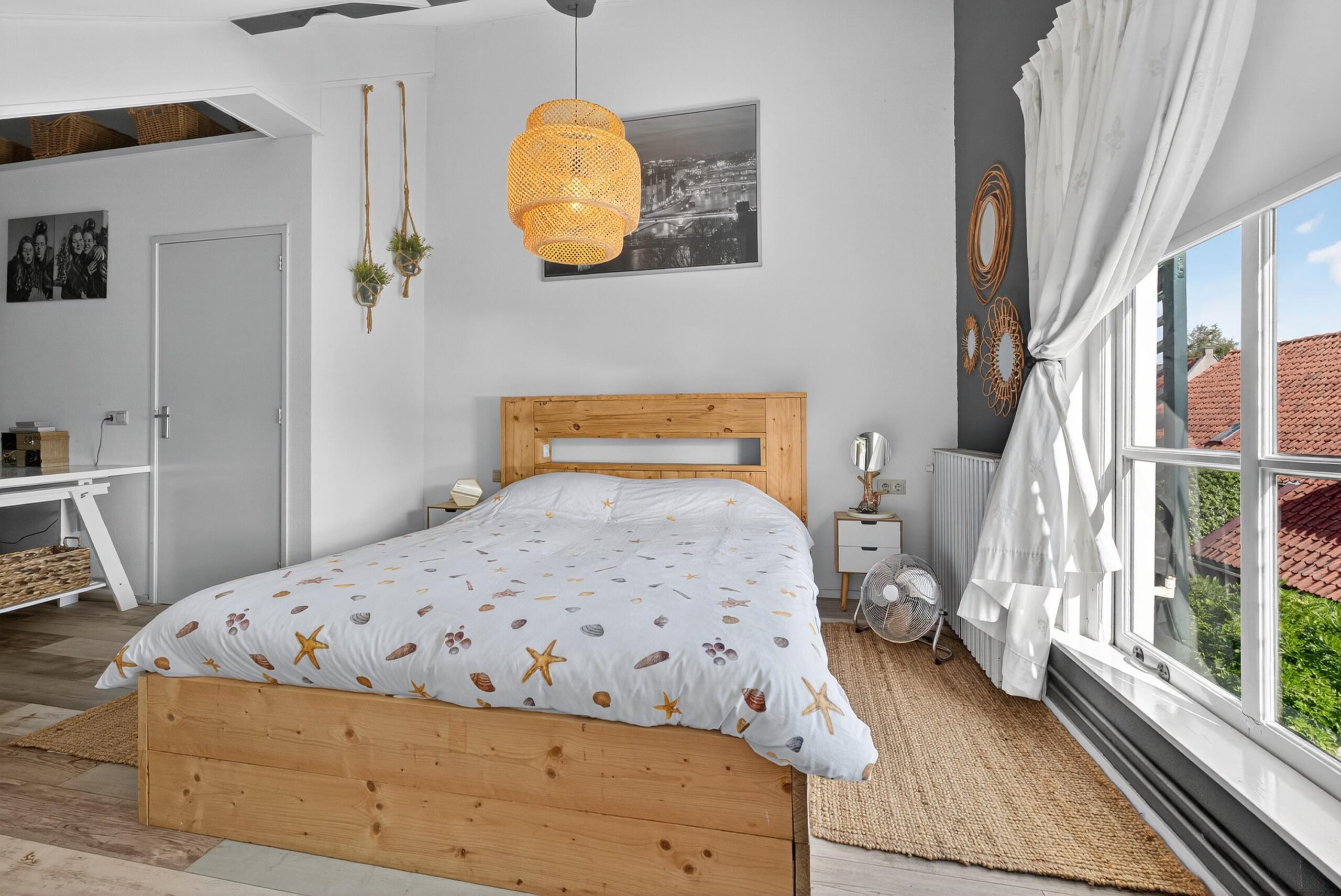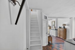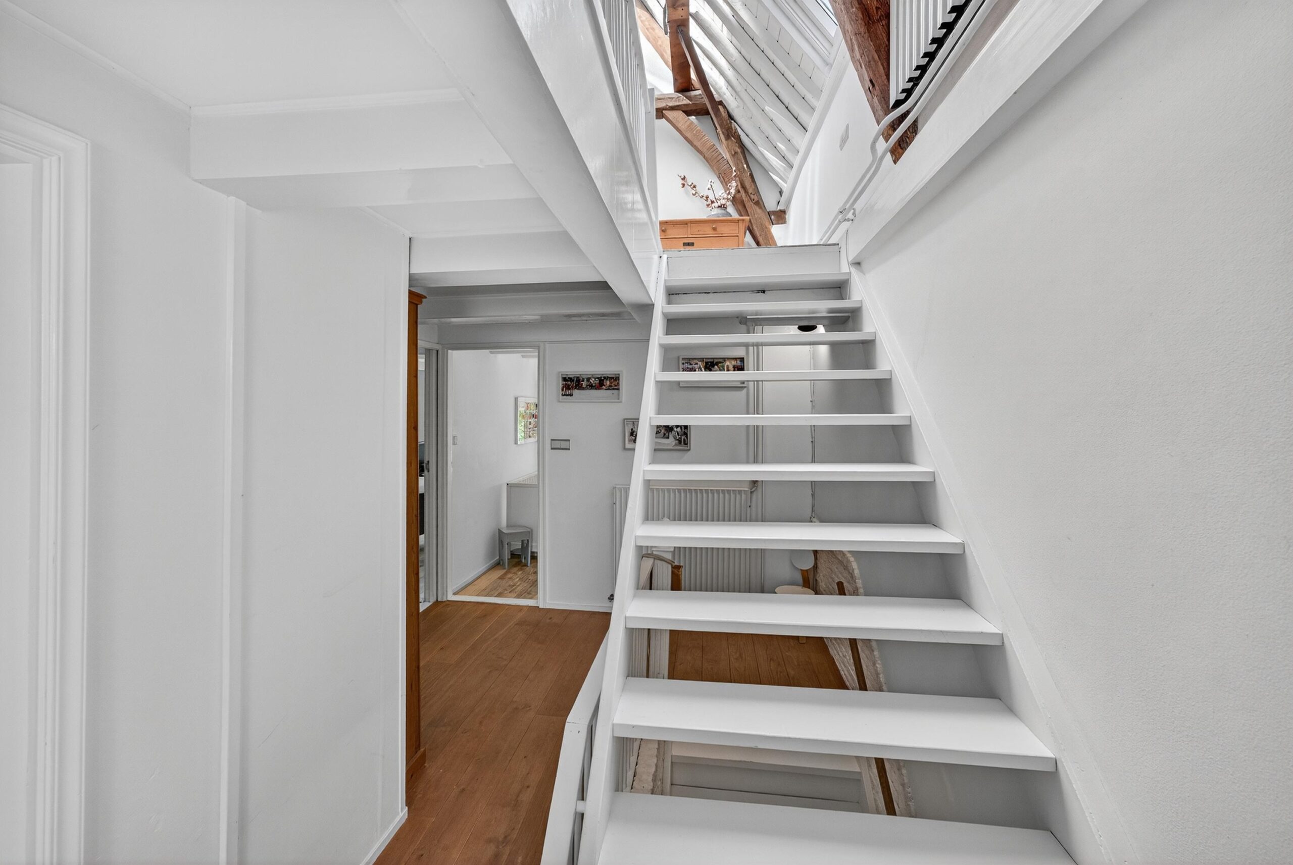 Zowel vanuit de keuken als ter hoogte van de woonkamer leidt een vaste trap u naar de eerste verdieping. Hier vindt u vier sfeervolle slaapkamers, elk met lage ramen die zorgen voor een mooie, zachte lichtinval. De slaapkamer aan de achterzijde, bereikbaar vanuit de keuken, is voorzien van een dakraam in het schuine dak en biedt toegang tot de badkamer met inloopdouche en wastafel.