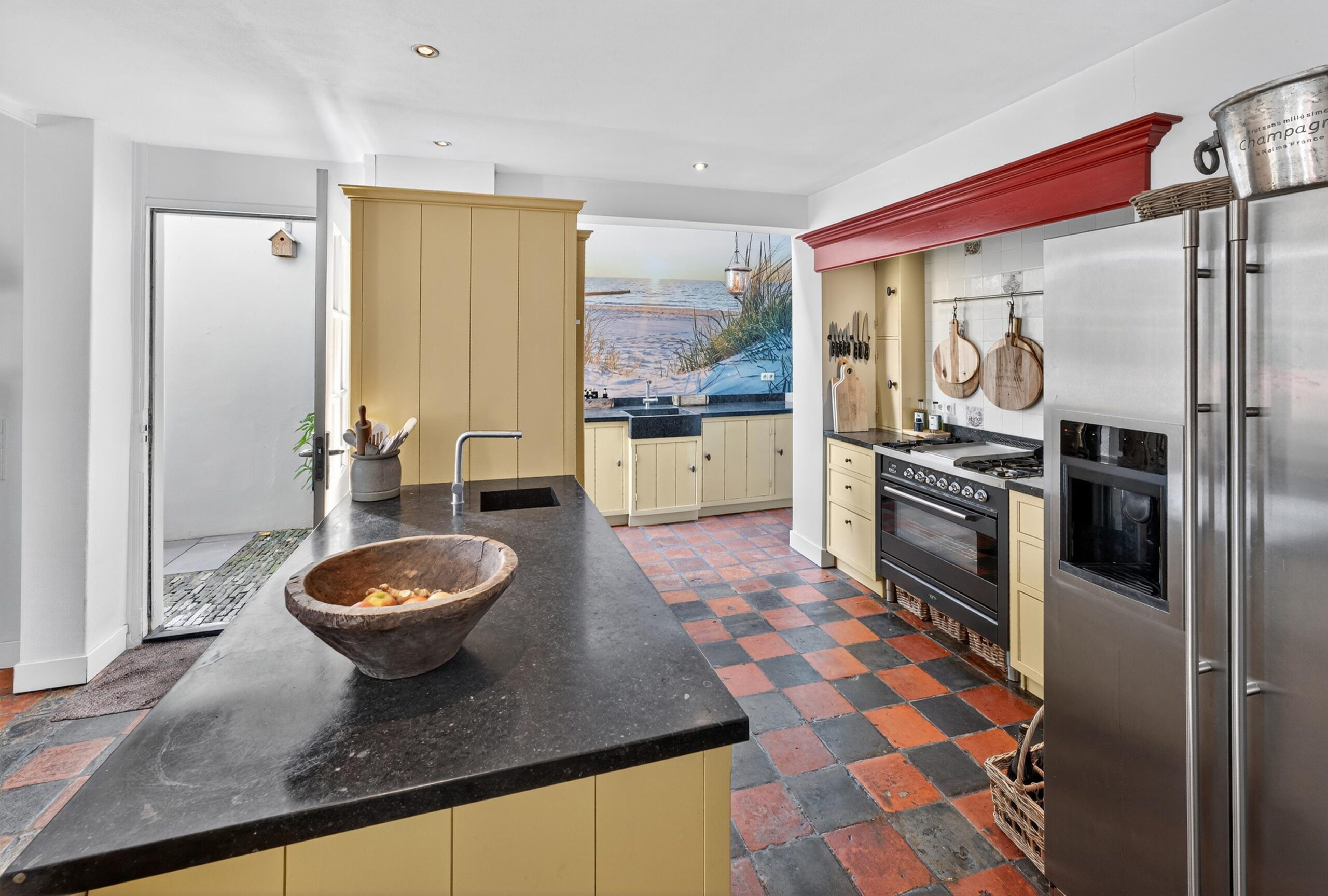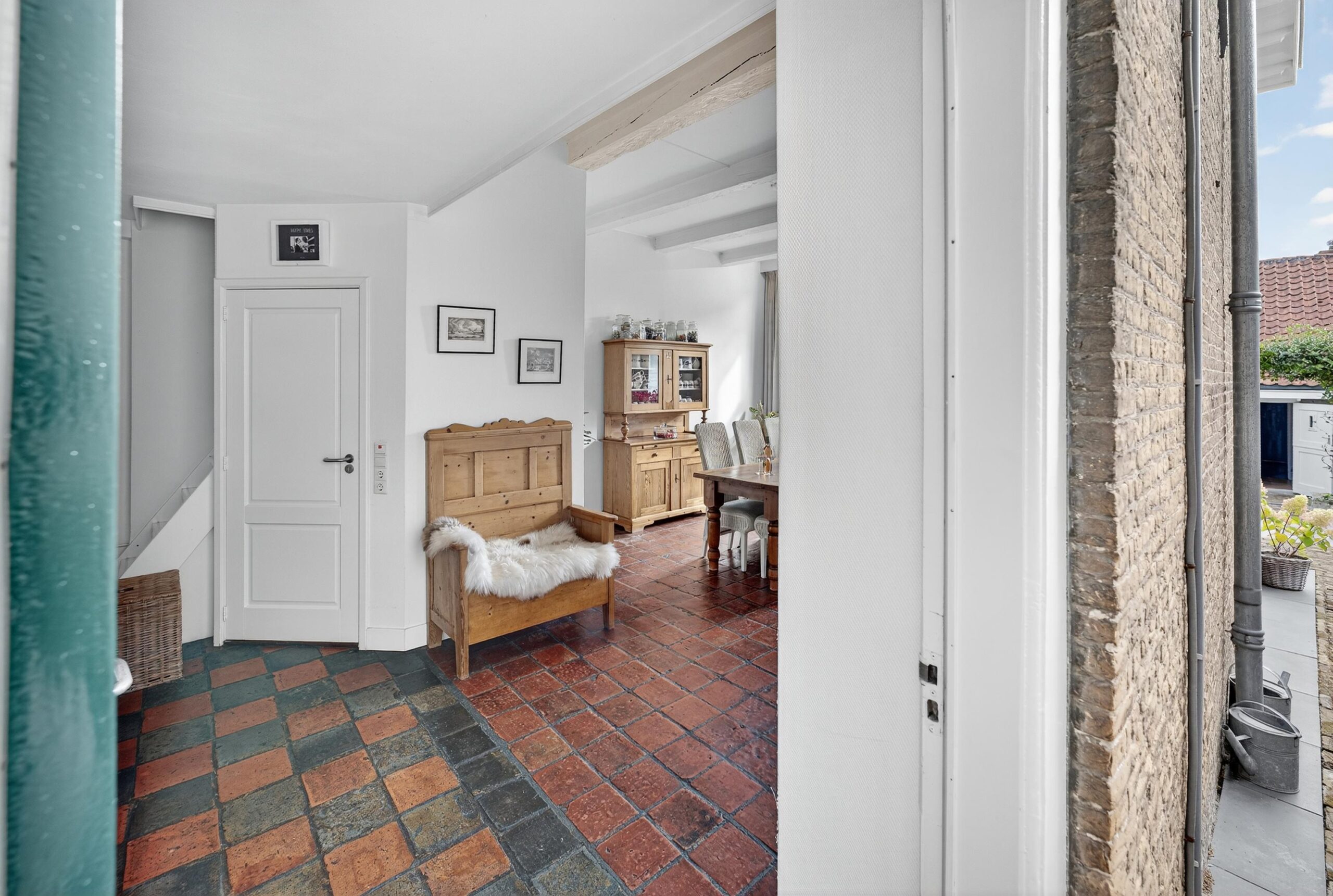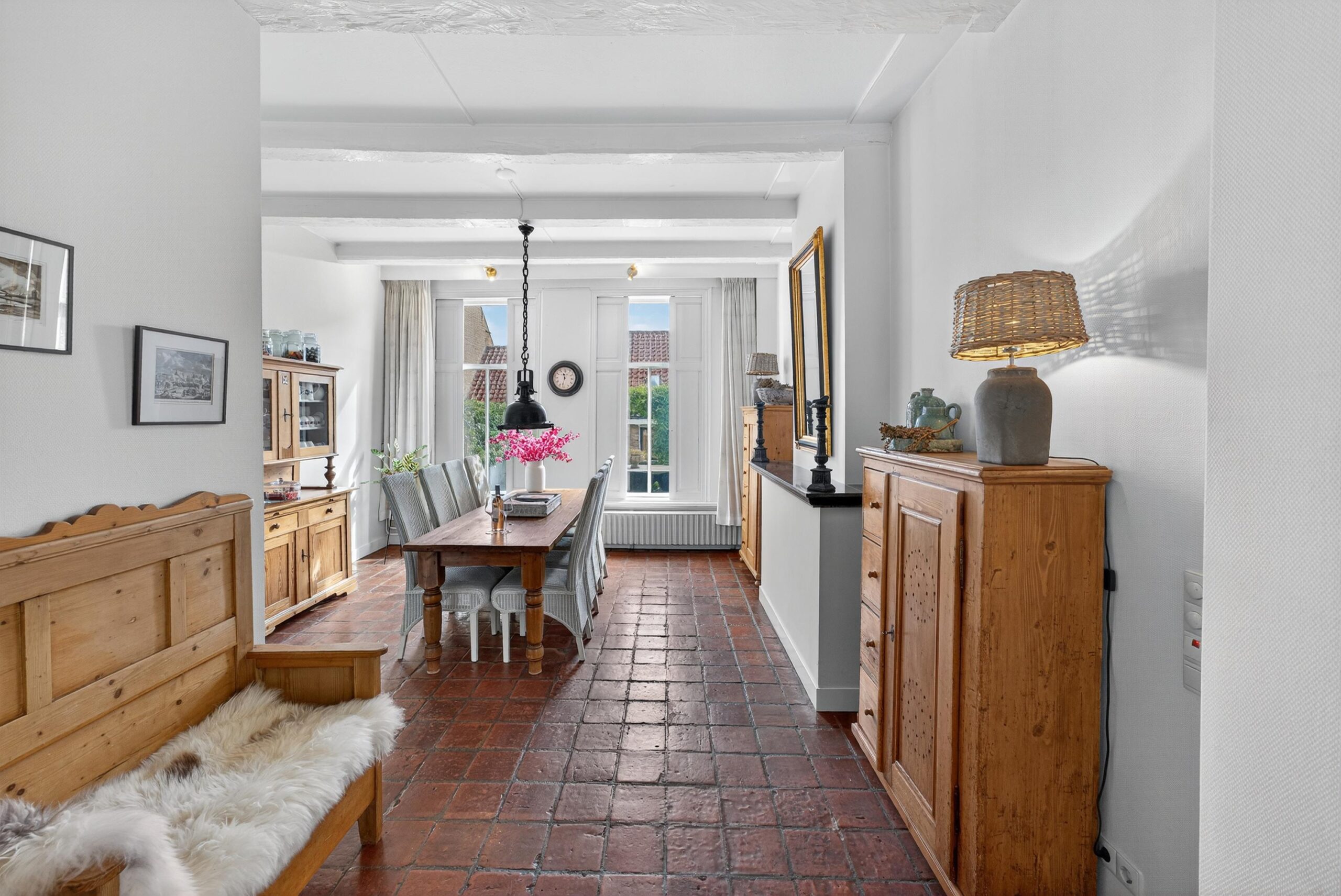 Wanneer u de Voorstraat oprijdt, voelt u de rijke historie van deze straat met zijn vele authentieke panden – waaronder deze prachtige woning. Bij binnenkomst komt u in de lichte entreehal, die toegang geeft tot de sfeervolle woonkamer. Het balkenplafond en de open haard maken het hier heerlijk comfortabel en uitnodigend. Vanuit de woonkamer bereikt u via een tweede hal de open keuken met eetgedeelte. In deze tweede hal is er ook toegang tot de toiletruimte. De landelijke keuken is knus en licht, mede dankzij het deel dat in de serre is geplaatst, en biedt uitzicht op de sfeervolle achtertuin. De keuken is voorzien van een spoeleiland en moderne apparatuur: gasfornuis, afzuigkap, combi-oven, koelkast, vriezer en vaatwasser. De tegelvloer sluit perfect aan bij de warme uitstraling van de keuken en het achterste deel van de keuken is voorzien van vloerverwarming. Grenzend aan de keuken vindt u de eetkamer – een fijne plek om met familie of vrienden uitgebreid te dineren, in klein of groot gezelschap.