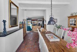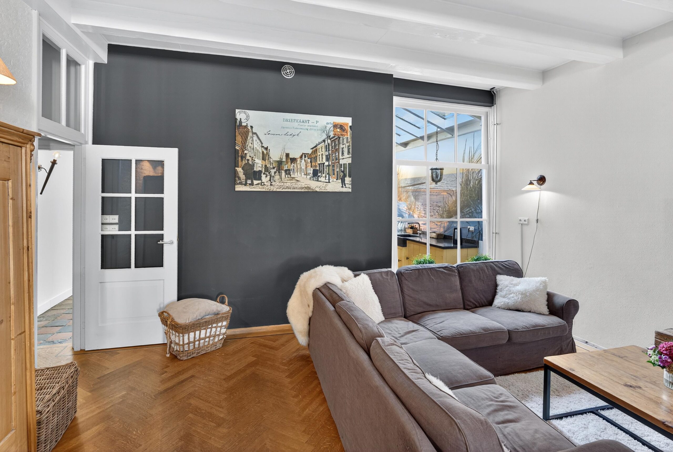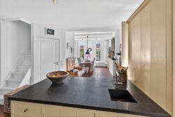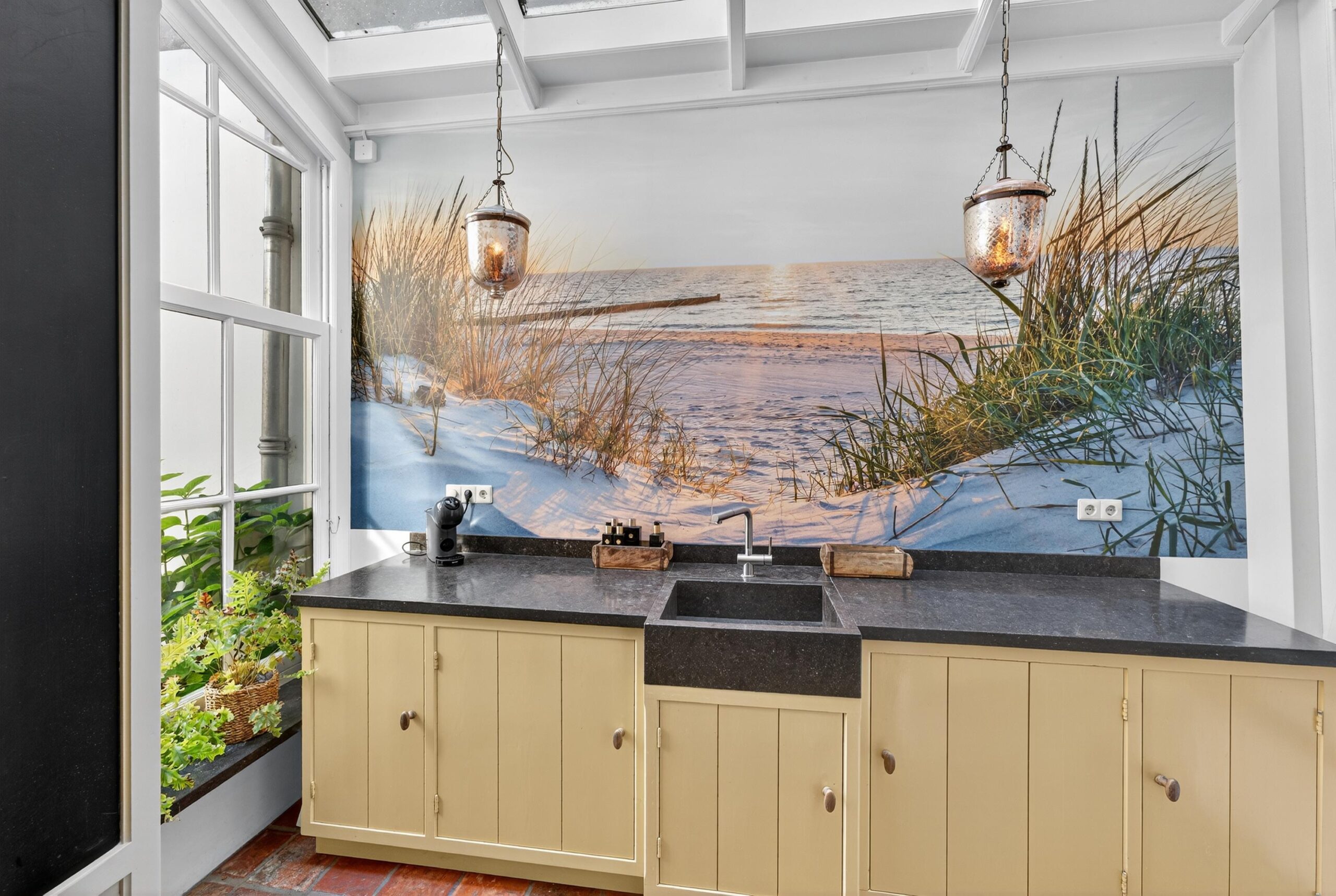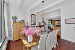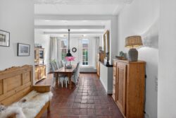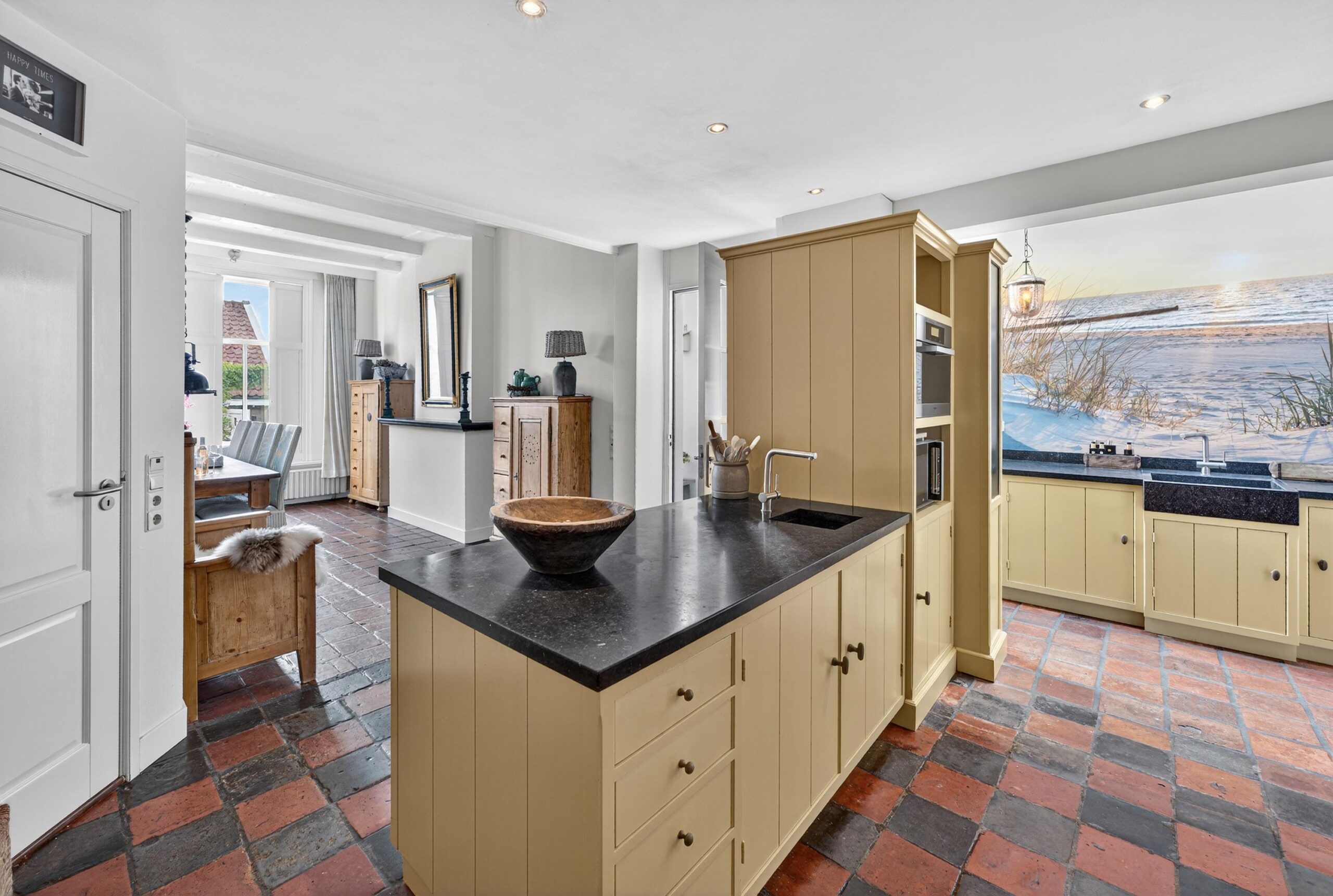 Wanneer u de Voorstraat oprijdt, voelt u de rijke historie van deze straat met zijn vele authentieke panden – waaronder deze prachtige woning. Bij binnenkomst komt u in de lichte entreehal, die toegang geeft tot de sfeervolle woonkamer. Het balkenplafond en de open haard maken het hier heerlijk comfortabel en uitnodigend. Vanuit de woonkamer bereikt u via een tweede hal de open keuken met eetgedeelte. In deze tweede hal is er ook toegang tot de toiletruimte. De landelijke keuken is knus en licht, mede dankzij het deel dat in de serre is geplaatst, en biedt uitzicht op de sfeervolle achtertuin. De keuken is voorzien van een spoeleiland en moderne apparatuur: gasfornuis, afzuigkap, combi-oven, koelkast, vriezer en vaatwasser. De tegelvloer sluit perfect aan bij de warme uitstraling van de keuken en het achterste deel van de keuken is voorzien van vloerverwarming. Grenzend aan de keuken vindt u de eetkamer – een fijne plek om met familie of vrienden uitgebreid te dineren, in klein of groot gezelschap.