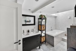 De trap aan de voorzijde van de woning brengt u naar een ruime overloop, van waaruit u drie extra slaapkamers bereikt. Ook deze kamers stralen warmte en gezelligheid uit, en één kamer beschikt over een royale inbouwkast. De tweede badkamer is compleet en luxe uitgevoerd met ligbad, inloopdouche, toilet en een dubbele wastafel met meubel – ideaal voor een ontspannen start van de dag.
